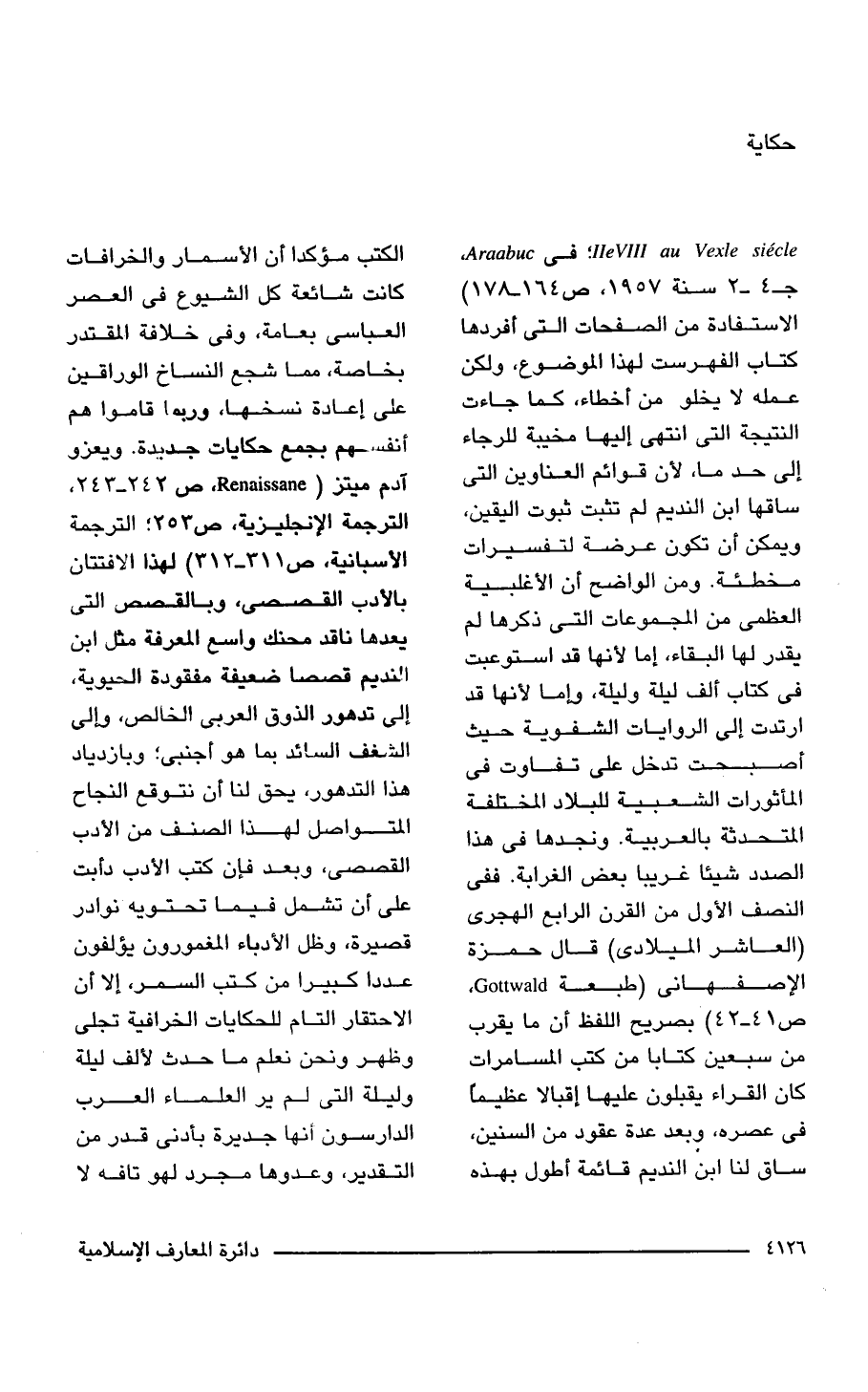 lleVlll au Vexle siecle؛ في Araabuc, جـ 4 - 2 سنة 1957، ص 164 - 178) الاستفادة من الصفحات التى أفردها كتاب الفهرست لهذا الموضوع، ولكن عمله لا يخلو من أخطاء، كما جاءت النتيجة التى انتهى إليها مخيبة للرجاء إلى حد ما، لأن قوائم العناوين التى ساقها ابن النديم لم تثبت ثبوت اليقين، ويمكن أن تكون عرضة لتفسيرات مخطئة. ومن الواضح أن الأغلبية العظمى من المجموعات التى ذكرها لم يقدر لها البقاء، إما لأنها قد استوعبت فى كتاب ألف ليلة وليلة، وإما لأنها قد ارتدت إلى الروايات الشفوية حيث أصبحت تدخل على تفاوت فى المأثورات الشعبية للبلاد المختلفة المتحدثة بالعربية. ونجدها فى هذا الصدد شيئًا غريبًا بعض الغرابة. ففى النصف الأول من القرن الرابع الهجرى (العاشر الميلادى) قال حمزة الإصفهانى (طبعة Gottwald, ص 41 - 42) بصريح اللفظ أن ما يقرب من سبعين كتابًا من كتب المسامرات كان القراء يقبلون عليها إقبالًا عظيمًا فى عصره، وبعد عدة عقود من السنين، ساق لنا ابن النديم قائمة أطول بهذه الكتب مؤكدا أن الأسمار والخرافات كانت شائعة كل الشيوع فى العصر العباسى بعامة، وفى خلافة المقتدر بخاصة، مما شجع النساخ الوراقين على إعادة نسخها، وربما قاموا هم أنفسهم بجمع حكايات جديدة. ويعزو آدم ميتز (Renaissane , ص 242 - 243, الترجمة الإنجليزية، ص 253؛ الترجمة الأسبانية، ص 311 - 312) لهذا الافتتان بالأدب القصصى، وبالقصص التى يعدها ناقد محنك واسع المعرفة مثل ابن النديم قصصا ضعيفة مفقودة الحيوية، إلى تدهور الذوق العربى الخالص، وإلى الشغف السائد بما هو أجنبى؛ وبازدياد هذا التدهور، يحق لنا أن نتوقع النجاح المتواصل لهذا الصنف من الأدب القصصى، وبعد فإن كتب الأدب دأبت على أن تشمل فيما تحتويه نوادر قصيرة، وظل الأدباء المغمورون يؤلفون عددًا كبيرًا من كتب السمر، إلا أن الاحتقار التام للحكايات الخرافية تجلى وظهر ونحن نعلم ما حدث لألف ليلة وليلة التى لم ير العلماء العرب الدارسون أنها جديرة بأدنى قدر من التقدير، وعدوها مجرد لهو تافه لا