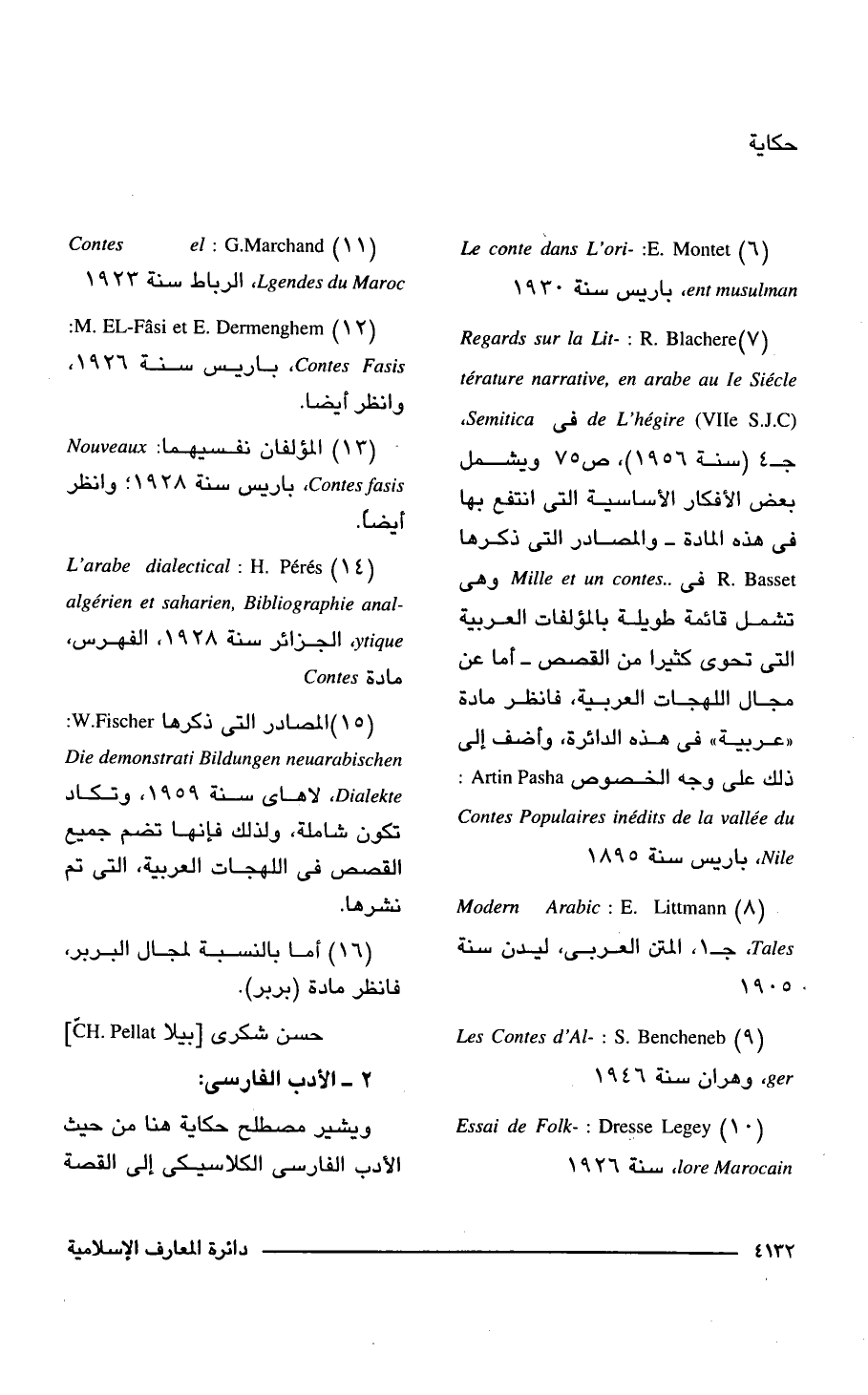 (7) Regards sur la Lit-: R. Blachere térature narrative, en arabe au Ie Siécle (de L'hegire (VIle S.J.C فى Semitica, جـ 4 (سنة 1956) , ص 75 ويشمل بعض الأفكار الأساسية التى انتفع بها فى هذه المادة - والمصادر التى ذكرها R. Basset فى Mille et un contes وهي تشمل قائمة طويلة بالمؤلفات العربية التى تحوى كثيرًا من القصص - أما عن مجال اللهجات العربية، فانظر مادة "عربية" فى هذه الدائرة، وأضف إلى ذلك على وجه الخصوص Artin Pasha: Contes Populaires inédits de la vallée du Nile, باريس سنة 1895