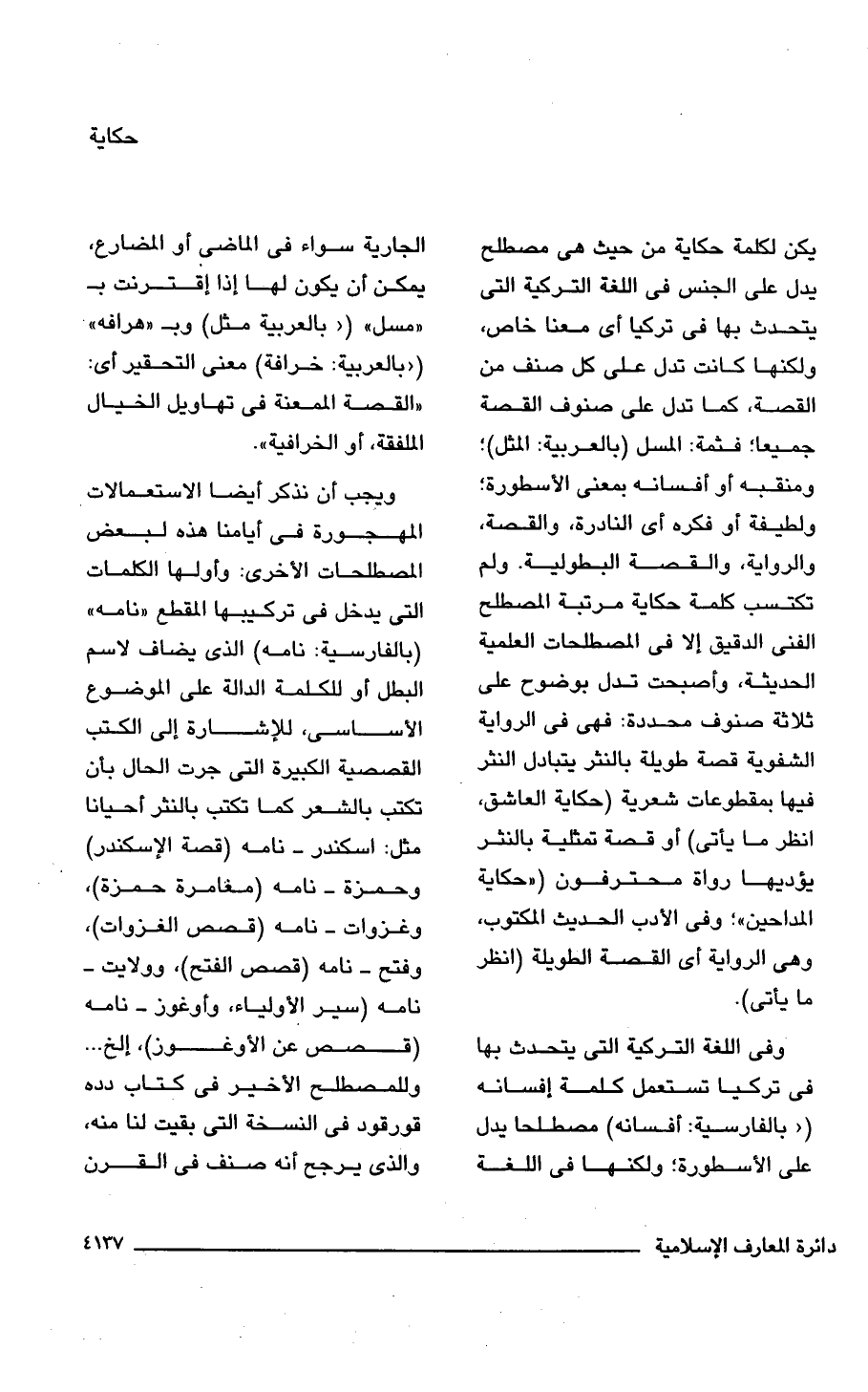 يكن لكلمة حكاية من حيث هى مصطلح يدل على الجنس فى اللغة التركية التى يتحدث بها فى تركيا أى معنى خاص، ولكنها كانت تدل على كل صنف من القصة، كما تدل على صنوف القصة جميعا؛ فثمة: المسل (بالعربية: المثل)؛ ومنقبه أو أفسانه بمعنى الأسطورة؛ ولطيفة أو فكره أى النادرة، والقصة، والرواية، والقصة البطولية. ولم تكتسب كلمة حكاية مرتبة المصطلح الفنى الدقيق إلا فى المصطلحات العلمية الحديثة، وأصبحت تدل بوضوح على ثلاثة صنوف محددة: فهى فى الرواية الشفوية قصة طويلة بالنثر يتبادل النثر فيها بمقطوعات شعرية (حكاية العاشق، انظر ما يأتى) أو قصة تمثلية بالنثر يؤديها رواة محترفون ("حكاية المداحين"؛ وفى الأدب الحديث المكتوب، وهى الرواية أى القصة الطويلة (انظر ما يأتى).