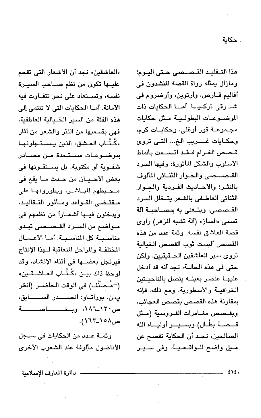 هذا التقليد القصصى حتى اليوم؛ وما زال يمثله رواة القصة المنشدون فى أقاليم قارص، وأرتوين، وأرضروم فى شرقى تركيا. أما الحكايات ذات الموضوعات البطولية مثل حكايات مجموعة قور أوغلى، وحكايات كرم، وحكايات غريب الخ ... التى تروى قصص الغرام فقد اتسمت بأنماط الأسلوب والشكل المأثورة: وفيها السرد القصصى والحوار الثنائى المألوف بالنثر؛ والأحاديث الفردية والجوار الثنائى العاطفى بالشعر يتخلل السرد القصصى، ويتغنى به بمصاحبة آلة تسمى "الساز" (آلة تشبه المزهر) راوى قصة العاشق نفسه. وثمة عدد من هذه القصص ألبست ثوب القصص الخيالية تروى سير العاشقين الحقيقيين، ولكن حتى فى هذه الحالة، نجد أنه قد أدخل عليها عنصر بعينه يتصل بالناحيتين الخرافية والأسطورية. ومع ذلك، فإنه بمقارنة هذه القصص بقصص العجائب، وبقصص مغامرات الفروسية (مثل قصة بطَّال) وبسير أولياء الله الصالحين، نجد أن الحكاية تفصح عن ميل واضح للواقعية. وفى سير "العاشقين" نجد أن الأشعار التى تقحم عليها تكون من نظم صاحب السيرة نفسه، وتستعاد على نحو تتفاوت فيه الأمانة. أما الحكايات التى لا تنتمى إلى هذه الفئة من السير الخيالية العاطفية، فهى بقسميها من النثر والشعر من آثار "كُتَّاب العشق" الذين يستهلونها بموضوعات مستمدة من مصادر شفوية أو مكتوبة، بل يستقونها فى بعض الأحيان من حدث ما يقع فى محيطهم المباشر، ويطورونها على مقتضى القواعد ومأثور التقاليد، ويدخلون فيها أشعارًا من نظمهم فى مواضع من السرد القصصى تبدو مناسبة كل المناسبة. أما الأعمال المختلفة والمراحل المتعاقبة لهذا الإنتاج فيرتجل بعضها فى أثناء الإنشاد، وقد لوحظ ذلك بين "كُتَّاب العاشقين" (= مُصَنِّف) فى الوقت الحاضر (انظر ب. ن. بوراتاو: المصدر السابق، ص 130 - 186، وبخاصة ص 158 - 163).