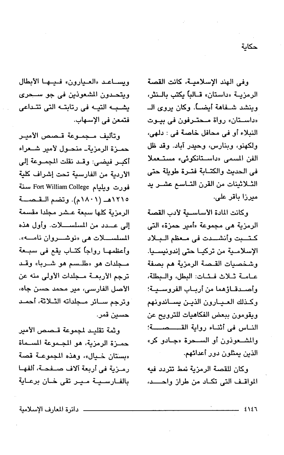 وتأليف مجموعة قصص الأمير حمزة الرمزية - منحول لأمير شعراء أكبر فيضى: وقد نقلت المجموعة إلى الأردية من الفارسية تحت إشراف كلية فورت ويليام Fort William College سنة 1215 هـ (1801 م). وتضم القصة الرمزية كلها سبعة عشر مجلدًا مقسمة إلى عدد من المسلسلات. وأول هذه المسلسلات هى "نوشروان نامه". وأعظمها رواجًا كتاب يقع فى سبعة مجلدات هو "طلسم هو شربا" وقد ترجم الأربعة مجلدات الأولى منه عن الأصل الفارسى، مير محمد حسن جاه، وترجم سائر مجلداته الثلاثة، أحمد حسين قمر.