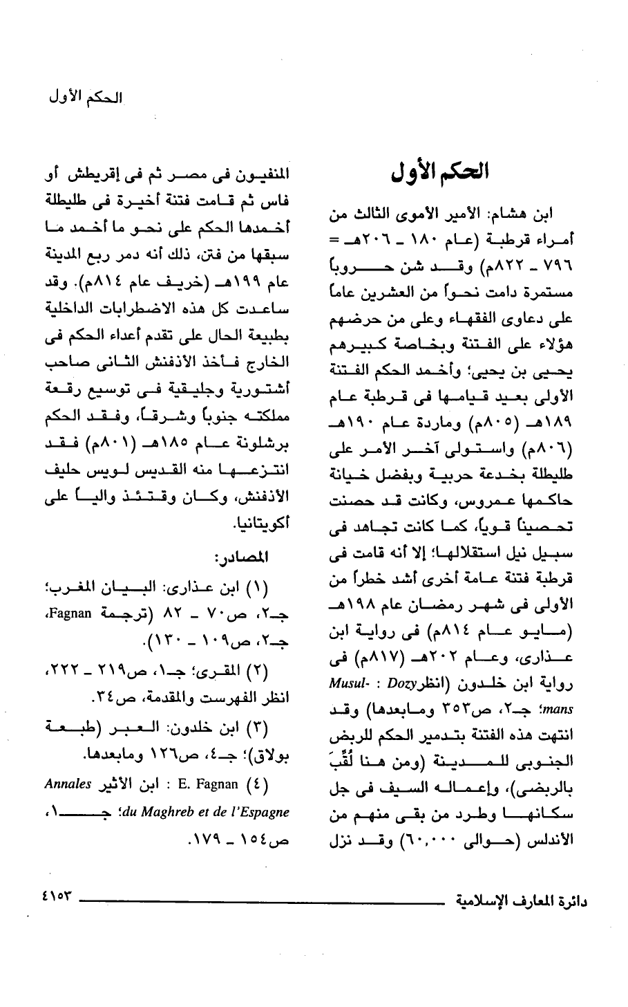 ابن هشام: الأمير الأموى الثالث من أمراء قرطبة (عام 180 - 206 هـ = 796 - 822 م) وقد شن حروبًا مستمرة دامت نحوًا من العشرين عامًا على دعاوى الفقهاء وعلى من حرضهم هؤلاء على الفتنة وبخاصة كبيرهم يحيى بن يحيى؛ وأخمد الحكم الفتنة الأولى بعيد قيامها فى قرطبة عام 189 هـ (805 م) وماردة عام 190 هـ (806 م) واستولى آخر الأمر على طليطلة بخدعة حربية وبفضل خيانة حاكمها عمروس، وكانت قد حصنت تحصينًا قويًا، كما كانت تجاهد فى سبيل نيل استقلالها؛ إلا أنه قامت فى قرطبة فتنة عامة أخرى أشد خطرًا من الأولى فى شهر رمضان عام 198 هـ (مايو عام 814 م) فى رواية ابن عذارى، وعام 202 هـ (817 م) فى رواية ابن خلدون (انظر Dozy: -Musul mans؛ جـ 2، ص 353 وما بعدها) وقد انتهت هذه الفتنة بتدمير الحكم للربض الجنوبى للمدينة (ومن هنا لُقِّبَ بالربضى)، وإعماله السيف فى جل سكانها وطرد من بقى منهم من الأندلس (حوالى 60,000) وقد نزل المنفيون فى مصر ثم فى إقريطش أو فاس ثم قامت فتنة أخيرة فى طليطلة أخمدها الحكم على نحو ما أخمد ما سبقها من فتن، ذلك أنه دمر ربع المدينة عام 199 هـ (خريف عام 814 م). وقد ساعدت كل هذه الاضطرابات الداخلية بطبيعة الحال على تقدم أعداء الحكم فى الخارج فأخذ الأذفنش الثانى صاحب أشتورية وجليقية فى توسيع رقعة مملكته جنوبًا وشرقًا، وفقد الحكم برشلونة عام 185 هـ (801 م) فقد انتزعها منه القديس لويس حليف الأذفنش، وكان وقتئذ واليًا على أكويتانيا.