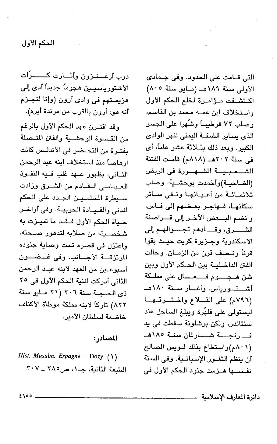 التى قامت على الحدود. وفى جمادى الأولى سنة 189 هـ (مايو سنة 805) اكتشفت مؤامرة لخلع الحكم الأول واستخلاف ابن عمه محمد بن القاسم، وصلب 72 قرطيبًا وشّهرا على الجسر الذى يساير الضفة اليمنى لنهر الوادى الكبير. وبعد ذلك بثلاثة عشر عامًا، أى فى سنة 202 هـ (818 م) قامت الفتنة الشعبية المشهورة فى الربض (الضاحية) وأخمدت بوحشية، وصلب ثلاثمائة من أعيانها ونفى سائر سكانها، فهاجر بعضهم إلى فاس، وانضم البعض الآخر إلى قراصنة الشرق، وقادهم تجوالهم إلى الاسكندرية وجزيرة كريت حيث بقوا قرنًا ونصف قرن من الزمان. وحالت الفتن الداخلية بين الحكم الأول وبين شن هجوم فعال على مملكة أشتورياس. وأغار سنة 180 هـ (796 م) على القلاع واخترقها ليستولى على قلهّرة ويبلغ الساحل عند سنتاندر، ولكن برشلونة سقطت فى يد فرنجة شارلمان سنة 185 هـ (801 م) واستطاع بذلك لويس الصالح أن ينظم الثغور الإسبانية. وفى السنة نفسها هزمت جنود الحكم الأول فى درب أرغنزون وأثارت كرّات الأشتورياسيين هجومًا جديدًا أدى إلى هزيمتهم فى وادى أرون (وإنا لنجزم أنه هو: أرون بالقرب من مرندة أبره).