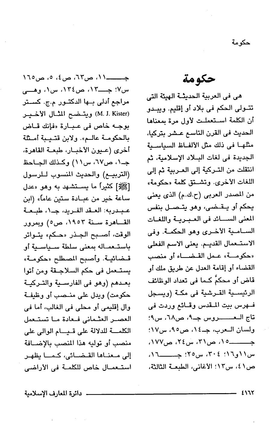 هى فى العربية الحديثة الهيئة التى تتولى الحكم فى بلاد أو إقليم. ويبدو أن الكلمة استعملت لأول مرة بمعناها الحديث فى القرن التاسع عشر بتركيا، مثلها فى ذلك مثل الألفاظ السياسية الجديدة فى لغات البلاد الإسلامية، ثم انتقلت من التركية إلى العربية ثم إلى اللغات الأخرى. وتشتق كلمة "حكومة" من المصدر العربى (ح. ك. م) الذى يعنى يحكم أو يقضى، وهو يتصل بنفس المعنى السائد فى العبرية واللغات السامية الأحرى وهو الحكمة. وفى الاستعمال القديم. يعنى الاسم الفعلى "حكومة" عمل القضاء أو منصب القضاء أو إقامة العدل عن طريق ملك أو قاض أو محكم كما فى تعداد الوظائف الرئيسية القرشية فى مكة (ويسجل فهرس بيت المقدس وقائع وردت فى تاج العروس جـ 9, ص 68, س 9؛ ولسان العرب، جـ 14, ص 95, س 17؛ جـ 15, ص 31, س 24, ص 177, س 11 و 16؛ 304, س 25؛ جـ 16, ص 41, س 13؛ الأغانى، الطبعة الثالثة، جـ 11, ص 63, ص 4, 5, ص 165 س 7؛ جـ 13, ص 134, س 1, وهى مراجع أدلى بها الدكتور م. ج. كستر (M. J. Kister) ويتضح المثال الأخير بوجه خاص فى عبارة "فإنك قاض بالحكومة عالم". ولابن قتيبة أمثلة أخرى (عيون الأخبار، طبعة القاهرة، جـ 1, ص 67, س 11) وكذلك الجاحظ (التربيع) والحديث المنسوب للرسول [- صلى الله عليه وسلم -] كثيرًا ما يستشهد به وهو "عدل ساعة خير من عبادة ستين عامًا"، (ابن عبد ربه: العقد الفريد، جـ 1، طبعة القاهرة سنة 1953, ص 5) وبمرور الوقت، أصبح الجذر "حكم" يتواتر باستعماله بمعنى سلطة سياسية أو قضائية. وأصبح المصطلح "حكومة" يستعمل فى حكم السلاجقة ومن أتوا بعدهم (وهو فى الفارسية والتركية حكومت) ويدل على منصب أو وظيفة وال إقليمى أو محلى فى الغالب، أما فى العصر العثمانى فعادة ما تستعمل الكلمة للدلالة على قيام الوالى على منصب أو توليه هذا المنصب بالإضافة إلى معناها القضائى، كما يظهر استعمال خاص للكلمة فى الأراضى