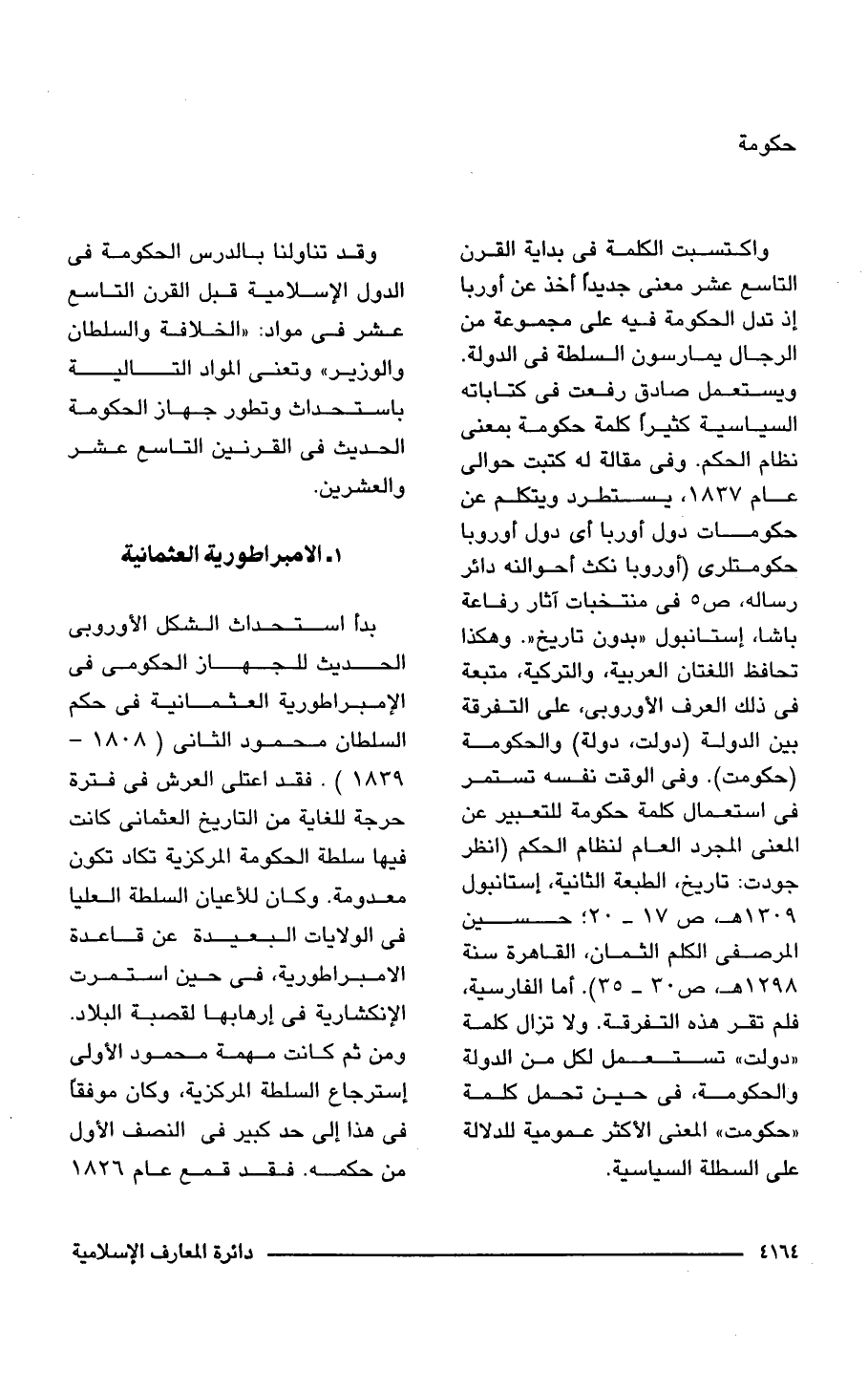 وقد تناولنا بالدرس الحكومة فى الدول الإسلامية قبل القرن التاسع عشر فى مواد: "الخلافة والسلطان والوزير" وتعنى المواد التالية باستحداث وتطور جهاز الحكومة الحديث فى القرنين التاسع عشر والعشرين.