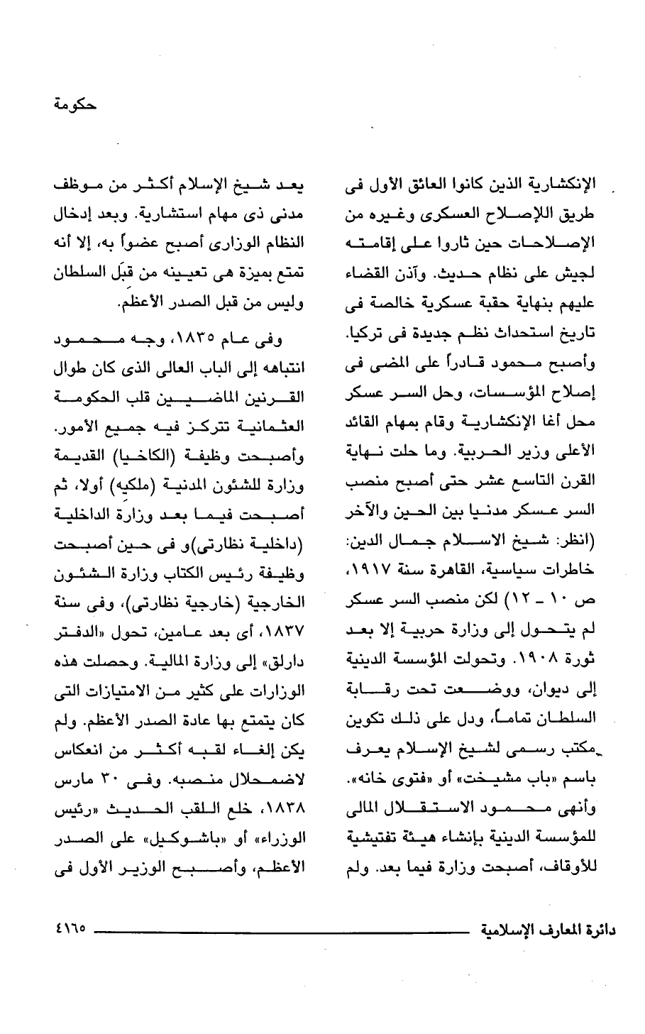 الإنكشارية الذين كانوا العائق الأول فى طريق الإصلاح العسكرى وغيره من الإصلاحات حين ثاروا على إقامته لجيش على نظام حديث. وأذن القضاء عليهم بنهاية حقبة عسكرية خالصة فى تاريخ استحداث نظم جديدة فى تركيا. وأصبح محمود قادرًا على المضى فى إصلاح المؤسسات، وحل السر عسكر محل أغا الإنكشارية وقام بمهام القائد الأعلى وزير الحربية. وما حلت نهاية القرن التاسع عشر حتى أصبح منصب السر عسكر مدنيا بين الحين والآخر (انظر: شيخ الاسلام جمال الدين: خاطرات سياسية، القاهرة سنة 1917, ص 10 - 12) لكن منصب السر عسكر لم يتحول إلى وزارة حربية إلا بعد ثورة 1908. وتحولت المؤسسة الدينية إلى ديوان، ووضعت تحت رقابة السلطان تمامًا، ودل على ذلك تكوين مكتب رسمى لشيخ الإسلام يعرف باسم "باب مشيخت" أو "فتوى خانه". وأنهى محمود الاستقلال المالى للمؤسسة الدينية بإنشاء هيئة تفتيشية للأوقاف، أصبحت وزارة فيما بعد. ولم يعد شيخ الإسلام أكثر من موظف مدنى ذى مهام استشارية. وبعد إدخال النظام الوزارى أصبح عضوًا به، إلا أنه تمتع بميزة هى تعيينه من قِبَل السلطان وليس من قبل الصدر الأعظم.