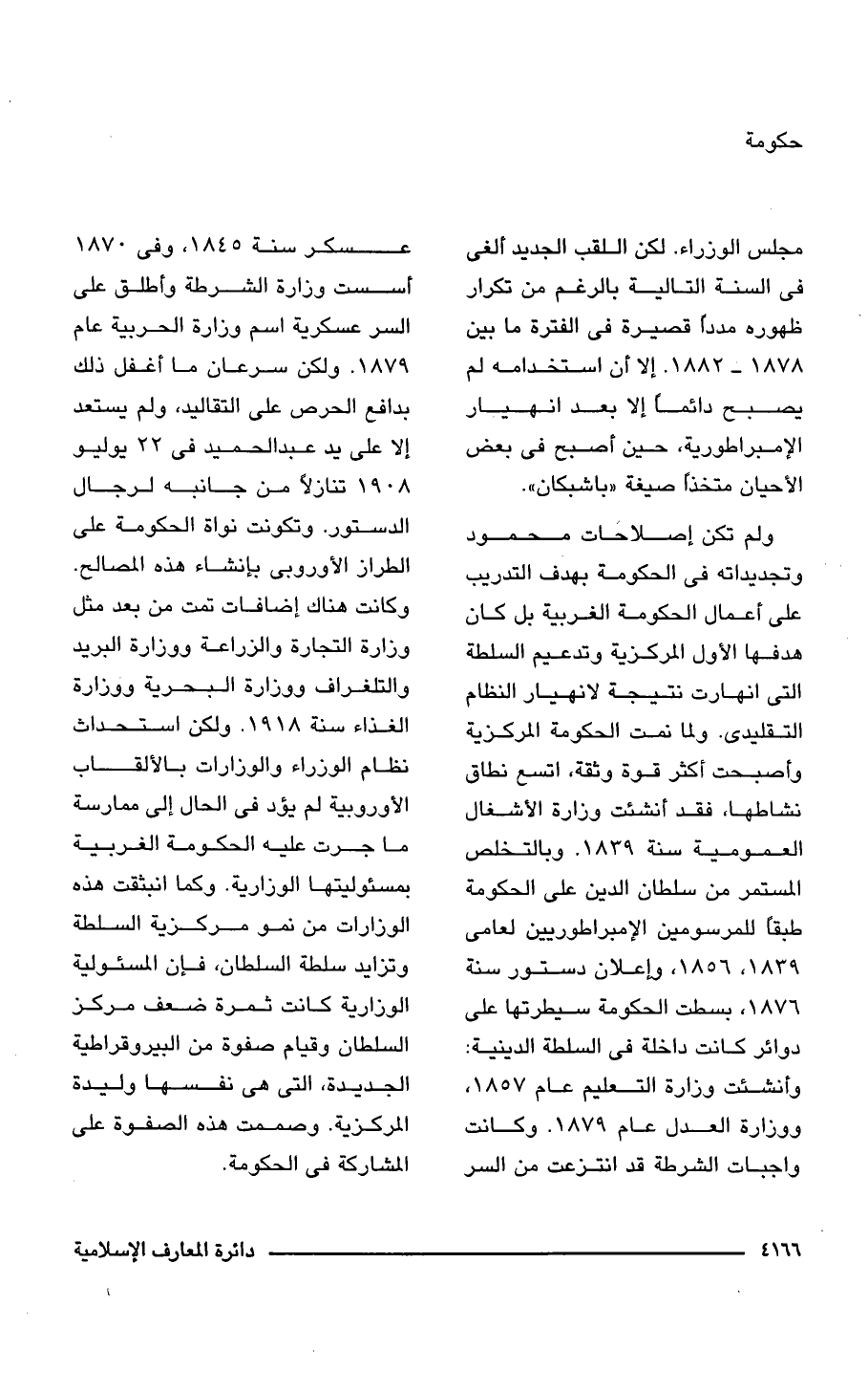 ولم تكن إصلاحات محمود وتجديداته فى الحكومة بهدف التدريب على أعمال الحكومة الغربية بل كان هدفها الأول المركزية وتدعيم السلطة التى انهارت نتيجة لانهيار النظام التقليدى. ولما نمت الحكومة المركزية وأصبحت أكثر قوة وثقة، اتسع نطاق نشاطها، فقد أنشئت وزارة الأشغال العمومية سنة 1839. وبالتخلص المستمر من سلطان الدين على الحكومة طبقًا للمرسومين الإمبراطوريين لعامى 1839, 1856, وإعلان دستور سنة 1876, بسطت الحكومة سيطرتها على دوائر كانت داخلة فى السلطة الدينية: وأنشئت وزارة التعليم عام 1857, ووزارة العدل عام 1879. وكانت واجبات الشرطة قد انتزعت من السر عسكر سنة 1845, وفى 1870 أسست وزارة الشرطة وأطلق على السر عسكرية اسم وزارة الحربية عام 1879. ولكن سرعان ما أغفل ذلك بدافع الحرص على التقاليد، ولم يستعد إلا على يد عبد الحميد فى 22 يوليو 1908 تنازلًا من جانبه لرجال الدستور. وتكونت نواة الحكومة على الطراز الأوروبى بإنشاء هذه المصالح. وكانت هناك إضافات تمت من بعد مثل وزارة التجارة والزراعة ووزارة البريد والتلغراف ووزارة البحرية ووزارة الغذاء سنة 1918. ولكن استحداث نظام الوزراء والوزارات بالألقاب الأوروبية لم يؤد فى الحال إلى ممارسة ما جرت عليه الحكومة الغربية بمسئوليتها الوزارية. وكما انبثقت هذه الوزارات من نمو مركزية السلطة وتزايد سلطة السلطان، فإن المسئولية الوزارية كانت ثمرة ضعف مركز السلطان وقيام صفوة من البيروقراطية الجديدة، التى هى نفسها وليدة المركزية. وصممت هذه الصفوة على المشاركة فى الحكومة.