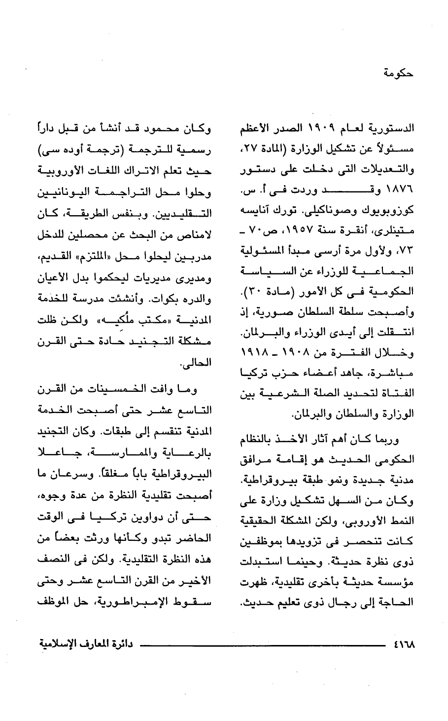 الدستورية لعام 1909 الصدر الأعظم مسئولًا عن تشكيل الوزارة (المادة 27، والتعديلات التى دخلت على دستور 1876 وقد وردت فى أ. س. كوزوبويوك وصوناكيلى. تورك آنايسه متينلرى، أنقرة سنة 1957, ص 70 - 73، ولأول مرة أرسى مبدأ المسئولية الجماعية للوزراء عن السياسة الحكومية فى كل الأمور (مادة 30). وأصبحت سلطة السلطان صورية، إذ انتقلت إلى أيدى الوزراء والبرلمان. وخلال الفترة من 1908 - 1918 مباشرة، جاهد أعضاء حزب تركيا الفتاة لتحديد الصلة الشرعية بين الوزارة والسلطان والبرلمان.