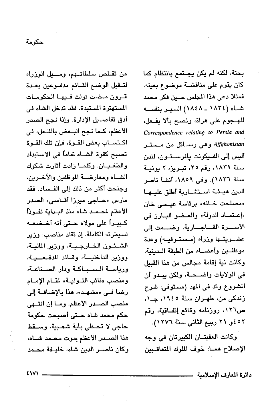 بحتة، لكنه لم يكن يجتمع بانتظام كما كان يقوم على مناقشة موضوع بعينه. فمثلا دعى هذا المجلس حين فكر محمد شاه (1834 - 1848) السير بنفسه للهجوم على هراة، ونصح بألا يفعل، Correspondence relating to Persia and Affghonistan وهى رسائل من مستر آليس إلى الفيكونت بالمرستون، لندن سنة 1839, رقم 25, تبريز, 2 يونية سنة 1836). وفى 1859، أنشأ ناصر الدين هيئة استشارية أطلق عليها "مصلحت خانه" برئاسة عيسى خان "إعتماد الدولة" والعضو البارز فى الأسرة القاجارية. وضمت إلى عضويتها وزراء (مستوفيه) وعدة موظفين وأعضاء من الطبقة الدينية. وكانت نية إقامة مجالس من هذا القبيل فى الولايات واضحة، ولكن يبدو أن المشروع وئد فى المهد (مستوفى: شرح زندكى من، طهران سنة 1945, جـ 1, ص 126, روزنامه وقائع إتفاقية، رقم 452 و 21 ربيع الثانى سنة 1276).