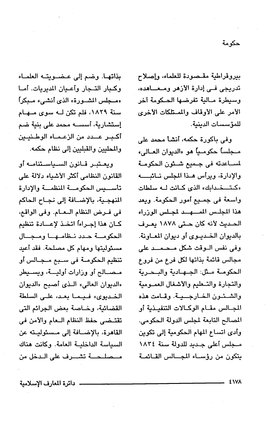 وفى باكورة حكمه، أنشأ محمد على مجلسًا حكوميًا هو "الديوان العالى" لمساعدته فى جميع شئون الحكومة والإدارة، ويرأس هذا المجلس نائبه "كتخدابك" الذى كانت له سلطات واسعة فى جميع أمور الحكومة. ويعد هذا المجلس الممهد لمجلس الوزراء الحديث لأنه كان حتى 1878 يعرف بالديوان الخديوى أو ديوان المعاونة. وفى نفس الوقت شكل محمد على مجالس قائمة بذاتها لكل فرع من فروع الحكومة مثل: الجهادية والبحرية والتجارة والتعليم والأشغال العمومية والشئون الخارجية. وقامت هذه المجالس مقام الوكالات التنفيذية أو المصالح التابعة لمجلس الدولة الحكومى. وأدى اتساع المهام الحكومية إلى تكوين مجلس أعلى جديد للدولة سنة 1834 يتكون من رؤساء المجالس القائمة بذاتها. وضم إلى عضويته العلماء وكبار التجار وأعيان المديريات. أما "مجلس المشورة" الذى أنشئ مبكرًا سنة 1829 , فلم تكن له سوى مهام إستشارية، أسسه محمد على بنية ضم أكبر عدد من الزعماء الوطنيين والمحليين والقبليين إلى نظام حكمه.