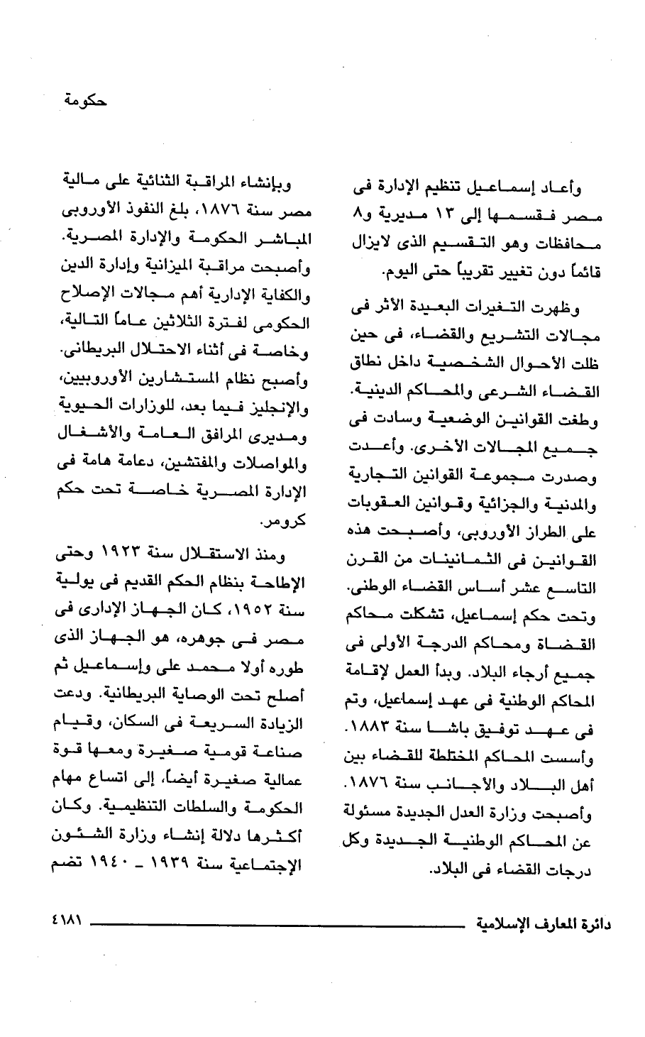 وبإنشاء المراقبة الثنائية على مالية مصر سنة 1876, بلغ النفوذ الأوروبى المباشر الحكومة والإدارة المصرية. وأصبحت مراقبة الميزانية وإدارة الدين والكفاية الإدارية أهم مجالات الإصلاح الحكومى لفترة الثلاثين عامًا التالية، وخاصة فى أثناء الاحتلال البريطانى. وأصبح نظام المستشارين الأوروبيين، والإنجليز فيما بعد، للوزارات الحيوية ومديرى المرافق العامة والأشغال والمواصلات والمفتشين، دعامة هامة فى الإدارة المصرية خاصة تحت حكم كرومر.