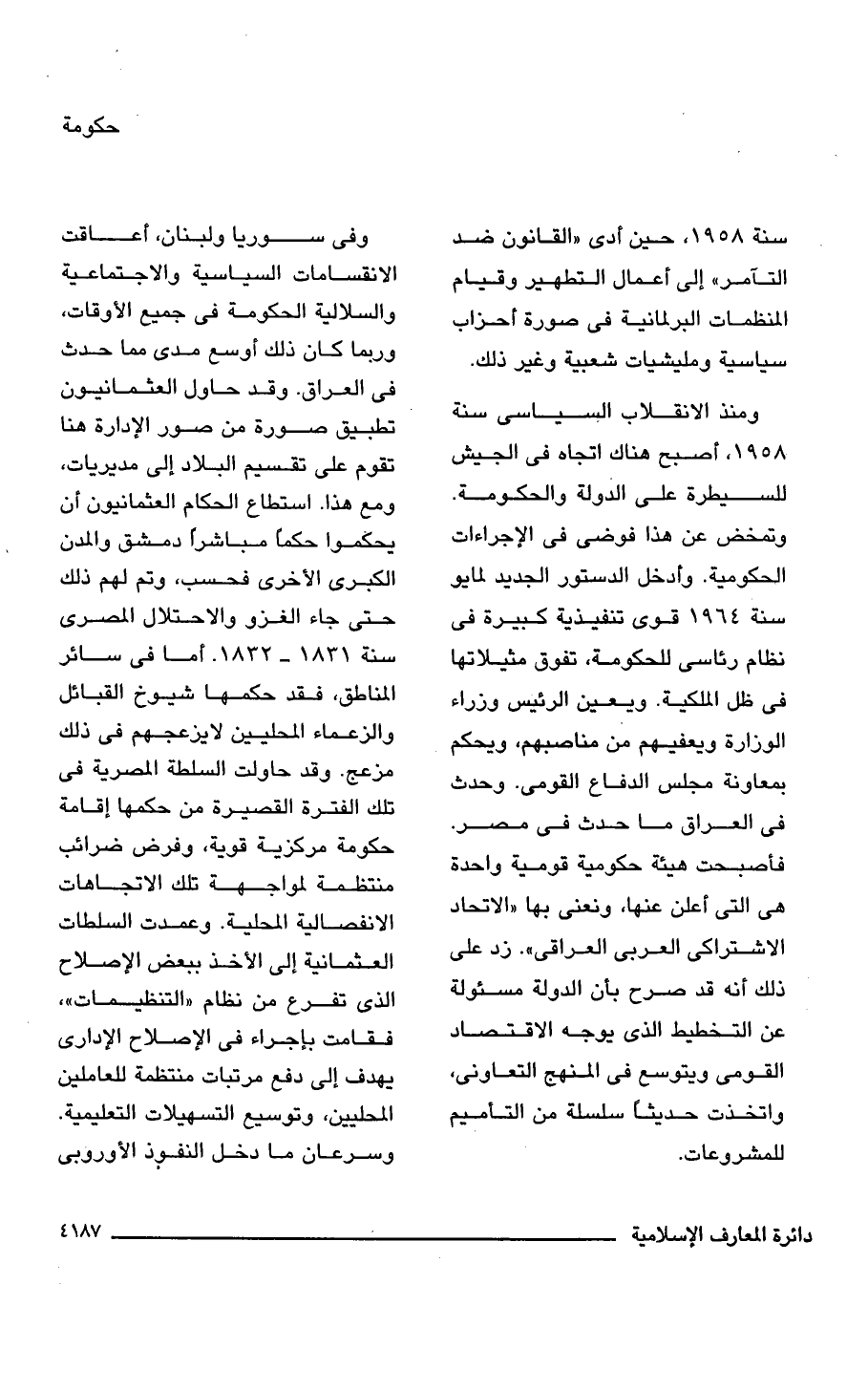 ومنذ الانقلاب السياسى سنة 1958، أصبح هناك اتجاه فى الجيش للسيطرة على الدولة والحكومة. وتمخض عن هذا فوضى فى الإجراءات الحكومية. وأدخل الدستور الجديد لمايو سنة 1964 قوى تنفيذية كبيرة فى نظام رئاسى للحكومة، تفوق مثيلاتها فى ظل الملكية. ويعين الرئيس وزراء الوزارة ويعفيهم من مناصبهم، ويحكم بمعاونة مجلس الدفاع القومى. وحدث فى العراق ما حدث فى مصر. فأصبحت هيئة حكومية قومية واحدة هى التى أعلن عنها، ونعنى بها "الاتحاد الاشتراكى العربى العراقى". زد على ذلك أنه قد صرح بأن الدولة مسئولة عن التخطيط الذى يوجه الاقتصاد القومى ويتوسع فى المنهج التعاونى، واتخذت حديثًا سلسلة من التأميم للمشروعات.