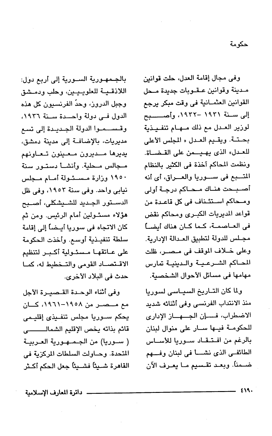 ولما كان التاريخ السياسى لسوريا منذ الانتداب الفرنسى وفى أثنائه شديد الاضطراب، فإن الجهاز الإدارى للحكومة فيها سار على منوال لبنان بالرغم من افتقاد سوريا للأساس الطائفى الذى نشأ فى لبنان وفهم ضمنًا. وبعد تقسيم ما يعرف الآن بالجمهورية السورية إلى أربع دول: اللاذقية للعلوييين، وحلب ودمشق وجبل الدروز، وحدّ الفرنسيون كل هذه الدول فى دولة واحدة سنة 1936, وقسموا الدولة الجديدة إلى تسع مديريات، بالإضافة إلى مدينة دمشق، يديرها مديرون معينون تعاونهم مجالس محلية. وأنشأ دستور سنة 1950 وزارة مسئولة أمام مجلس نيابى واحد. وفى سنة 1953، وفى ظل الدستور الجديد للشيشكلى، أصبح هؤلاء مسئولين أمام الرئيس. ومن ثم كان الاتجاه فى سوريا أيضًا إلى إقامة سلطة تنفيذية أوسع. وأخذت الحكومة على عاتقها مسئولية أكبر لتنظيم الاقتصاد القومى والتخطيط له، كما حدث فى البلاد الأخرى.