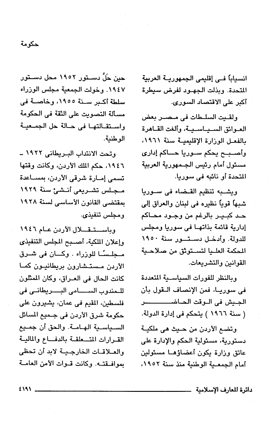 وباستقلال الأردن عام 1946 وإعلان الملكية، أصبح المجلس التنفيذى مجلسًا للوزراء. وكان فى شرق الأردن مستشارون بريطانيون كما كانت الحال فى العراق، وكان الممثلون للمندوب السامى البريطانى فى فلسطين، المقيم فى عمان، يشيرون على حكومة شرق الأردن فى جميع المسائل السياسية الهامة. والحق أن جميع القرارات المتعلقة بالدفاع والمالية والعلاقات الخارجية لا بد أن تحظى بموافقته. وكانت قوات الأمن العامة
