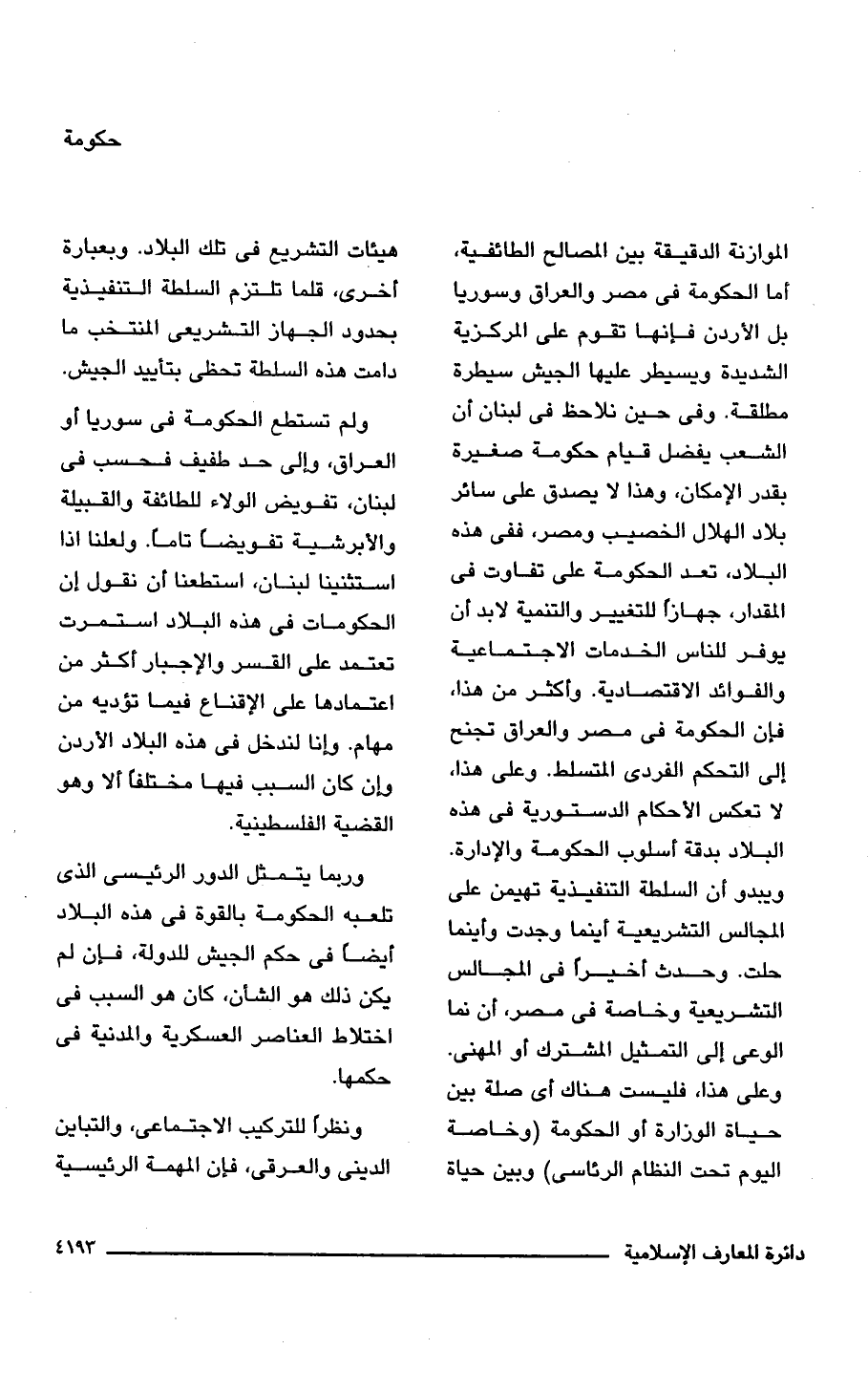 الموازنة الدقيقة بين المصالح الطائفية، أما الحكومة فى مصر والعراق وسوريا بل الأردن فإنها تقوم على المركزية الشديدة ويسيطر عليها الجيش سيطرة مطلقة. وفى حين نلاحظ فى لبنان أن الشعب يفضل قيام حكومة صغيرة بقدر الإمكان، وهذا لا يصدق على سائر بلاد الهلال الخصيب ومصر، ففى هذه البلاد، تعد الحكومة على تفاوت فى المقدار، جهازًا للتغيير والتنمية لا بد أن يوفر للناس الخدمات الاجتماعية والفوائد الاقتصادية. وأكثر من هذا، فإن الحكومة فى مصر والعراق تجنح إلى التحكم الفردى المتسلط. وعلى هذا، لا تعكس الأحكام الدستورية فى هذه البلاد بدقة أسلوب الحكومة والإدارة. ويبدو أن السلطة التنفيذية تهيمن على المجالس التشريعية أينما وجدت وأينما حلت. وحدث أخيرًا فى المجالس التشريعية وخاصة فى مصر، أن نما الوعى إلى التمثيل المشترك أو المهنى. وعلى هذا، فليست هناك أى صلة بين حياة الوزارة أو الحكومة (وخاصة اليوم تحت النظام الرئاسى) وبين حياة هيئات التشريع فى تلك البلاد. وبعبارة أخرى، قلما تلتزم السلطة التنفيذية بحدود الجهاز التشريعى المنتخب ما دامت هذه السلطة تحظى بتأييد الجيش.