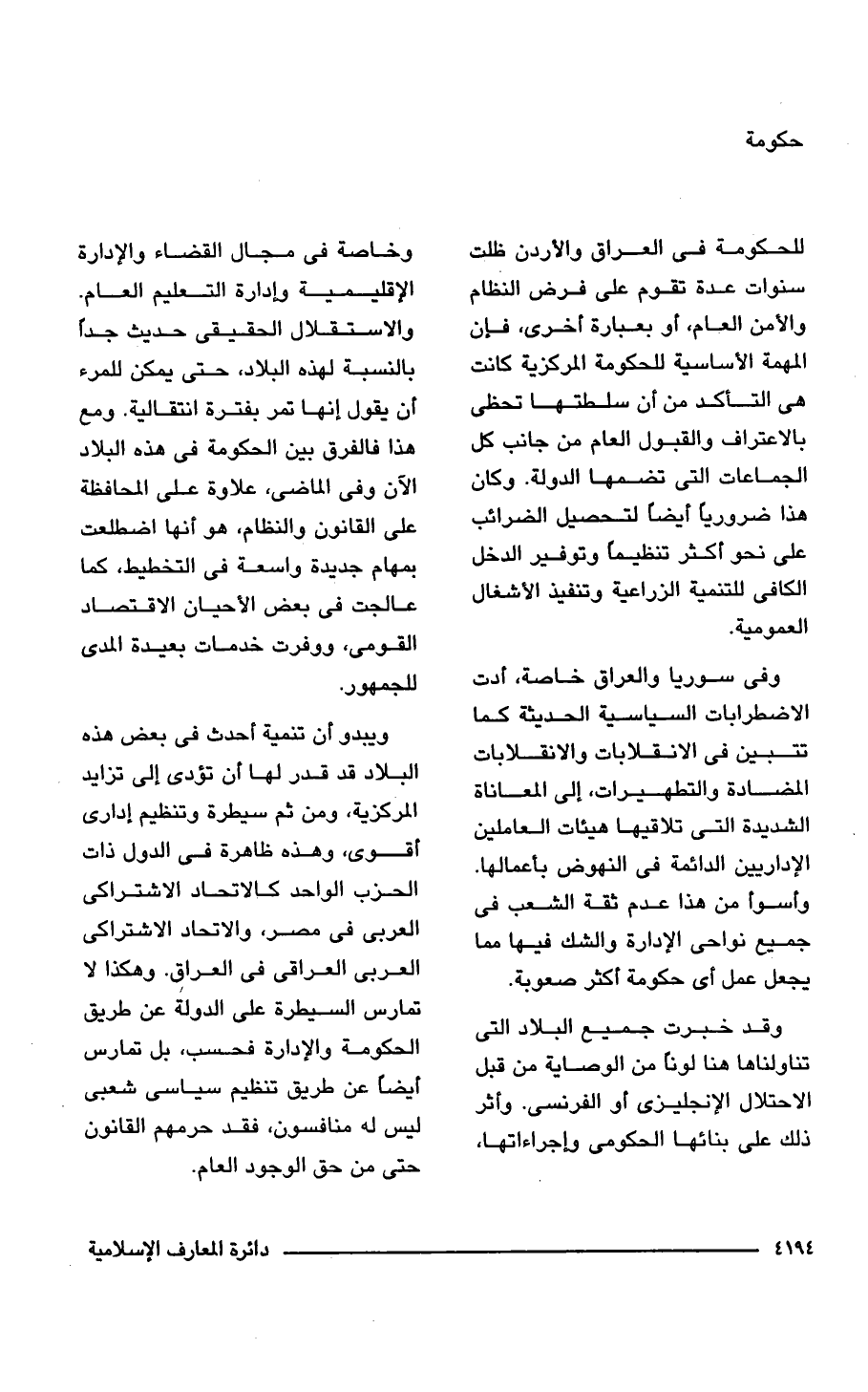 للحكومة فى العراق والأردن ظلت سنوات عدة تقوم على فرض النظام والأمن العام، أو بعبارة أخرى، فإن المهمة الأساسية للحكومة المركزية كانت هى التأكد من أن سلطتها تحظى بالاعتراف والقبول العام من جانب كل الجماعات التى تضمها الدولة. وكان هذا ضروريًا أيضًا لتحصيل الضرائب على نحو أكثر تنظيمًا وتوفير الدخل الكافى للتنمية الزراعية وتنفيذ الأشغال العمومية.