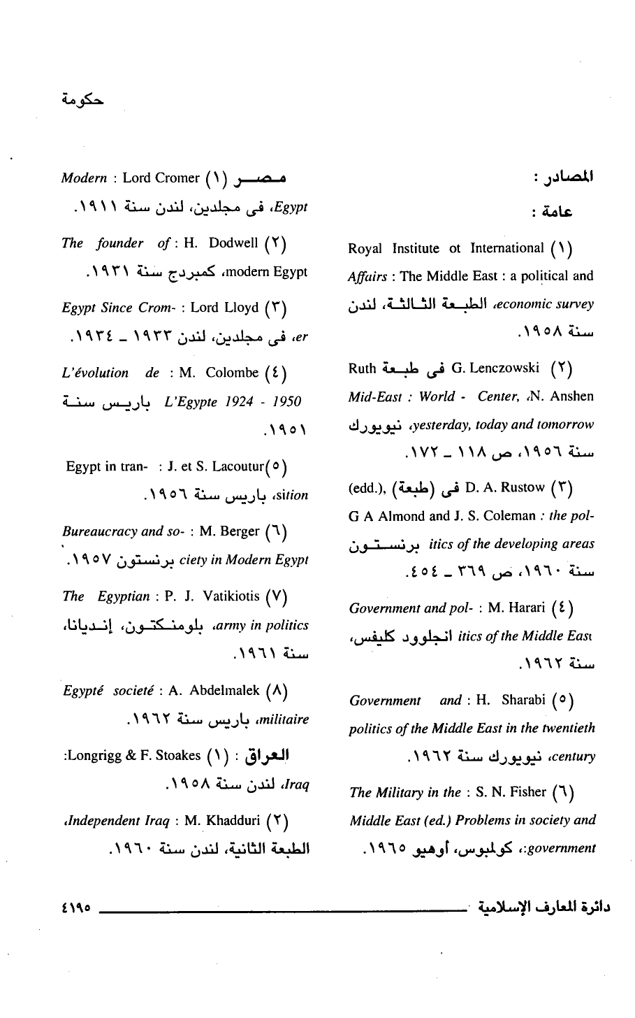(2) G. Lenczowski فى طبعة Ruth Mid-East: World - Center, N. Anshen yesterday, today and tomorrow, نيويورك سنة 1956، ص 118 - 172.