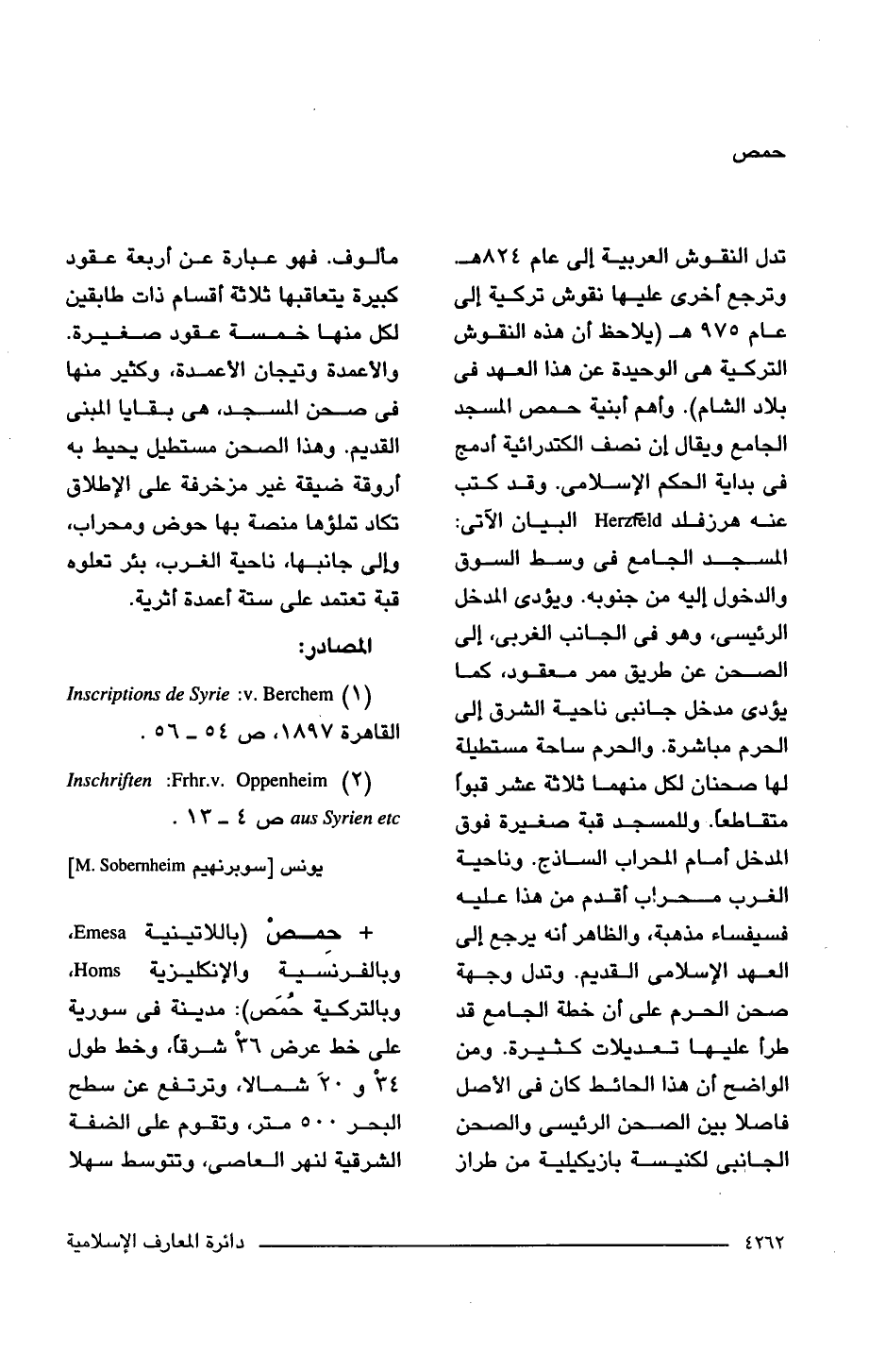 تدل النقوش العربية إلى عام 824 هـ. وترجع أخرى عليها نقوش تركية إلى عام 975 هـ (يلاحظ أن هذه النقوش التركية هى الوحيدة عن هذا العهد فى بلاد الشام). وأهم أبنية حمص المسجد الجامع ويقال إن نصف الكتدرائية أدمج فى بداية الحكم الإسلامى. وقد كتب عنه هرزفلد Herzfeld البيان الآتى: المسجد الجامع فى وسط السوق والدخول إليه من جنوبه. ويؤدى المدخل الرئيسى، وهو فى الجانب الغربى، إلى الصحن عن طريق ممر معقود، كما يؤدى مدخل جانبى ناحية الشرق إلى الحرم مباشرة. والحرم ساحة مستطيلة لها صحنان لكل منهما ثلاثة عشر قبوًا متقاطعًا. وللمسجد قبة صغيرة فوق المدخل أمام المحراب الساذج. وناحية الغرب محراب أقدم من هذا عليه فسيفساء مذهبة، والظاهر أنه يرجع إلى العهد الإسلامى القديم. وتدل وجهة صحن الحرم على أن خطة الجامع قد طرأ عليها تعديلات كثيرة. ومن الواضح أن هذا الحائط كان فى الأصل فاصلا بين الصحن الرئيسى والصحن الجانبى لكنيسة بازيكيلية من طراز مألوف. فهو عبارة عن أربعة عقود كبيرة يتعاقبها ثلاثة أقسام ذات طابقين لكل منها خمسة عقود صغيرة. والأعمدة وتيجان الأعمدة، وكثير منها فى صحن المسجد، هى بقايا المبنى القديم. وهذا الصحن مستطيل يحيط به أروقة ضيقة غير مزخرفة على الإطلاق تكاد تملؤها منصة بها حوض ومحراب، وإلى جانبها، ناحية الغرب، بئر تعلوه قبة تعتمد على ستة أعمدة أثرية.