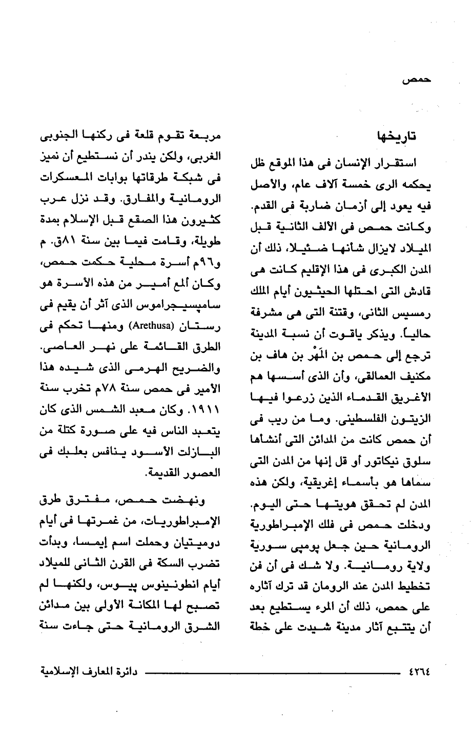 استقرار الإنسان فى هذا الموقع ظل يحكمه الرى خمسة آلاف عام، والأصل فيه يعود إلى أزمان ضاربة فى القدم. وكانت حمص فى الألف الثانية قبل الميلاد لا يزال شأنها ضئيلا، ذلك أن المدن الكبرى فى هذا الإقليم كانت هى قادش التى احتلها الحيثيون أيام الملك رمسيس الثانى، وقتنة التى هى مشرفة حاليًا. ويذكر ياقوت أن نسبة المدينة ترجع إلى حمص بن المَهْر بن هاف بن مكنيف العمالقى، وأن الذى أسسها هم الأغريق القدماء الذين زرعوا فيها الزيتون الفلسطينى. وما من ريب فى أن حمص كانت من المدائن التى أنشأها سلوق نيكاتور أو قل إنها من المدن التى سماها هو بأسماء إغريقية، ولكن هذه المدن لم تحقق هويتها حتى اليوم. ودخلت حمص فى فلك الإمبراطورية الرومانية حين جعل بومبى سورية ولاية رومانية. ولا شك فى أن فن تخطيط المدن عند الرومان قد ترك آثاره على حمص، ذلك أن المرء يستطيع بعد أن يتتبع آثار مدينة شيدت على خطة مربعة تقوم قلعة فى ركنها الجنوبى الغربى، ولكن يندر أن نستطيع أن نميز فى شبكة طرقاتها بوابات المعسكرات الرومانية والمفارق. وقد نزل عرب كثيرون هذا الصقع قبل الإسلام بمدة طويلة، وقامت فيما بين سنة 81 ق. م و 96 م أسرة محلية حكمت حمص، وكان ألمع أمير من هذه الأسرة هو سامبسيجراموس الذى آثر أن يقيم فى رستان (Arethusa) ومنها تحكم فى الطرق القائمة على نهر العاصى. والضريح الهرمى الذى شيده هذا الأمير فى حمص سنة 78 م تخرب سنة 1911. وكان معبد الشمس الذى كان يتعبد الناس فيه على صورة كتلة من البازلت الأسود ينافس بعلبك فى العصور القديمة.