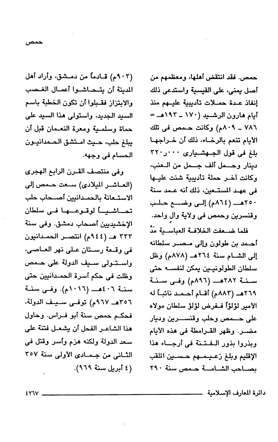 حمص. فقد انتقض أهلها، ومعظمهم من أصل يمنى، على القيسية واستدعى ذلك إنفاذ عدة حملات تأديبية عليهم منذ أيام هارون الرشيد (170 - 193 هـ = 786 - 809 م) وكانت حمص فى تلك الأيام تنعم بالرخاء، ذلك أن خراجها بلغ فى قول الجهشيارى 320,000 دينار وحمل ألف جمل من العنب، وكانت آخر حملة تأديبية شنت عليها فى عهد المستعين، ذلك أنه عمد سنة 250 هـ (864 م) إلى وضع حلب وقنسرين وحمص فى ولاية والٍ واحد.