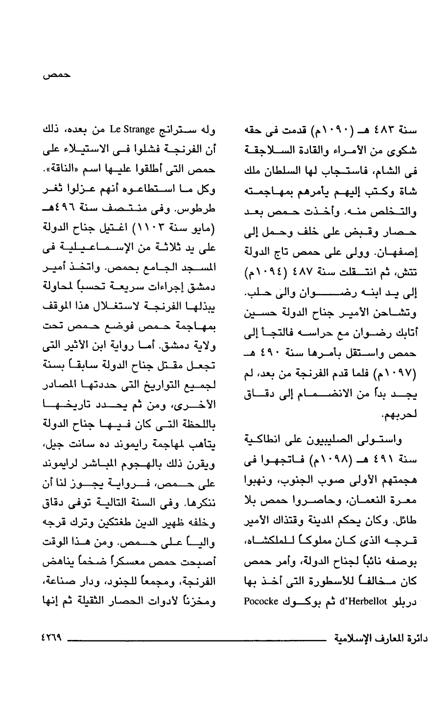 واستولى الصليبيون على انطاكية سنة 491 هـ (1098 م) فاتجهوا فى هجمتهم الأولى صوب الجنوب، ونهبوا معرة النعمان، وحاصروا حمص بلا طائل. وكان يحكم المدينة وقتذاك الأمير قرجه الذى كان مملوكًا للملكشاه، بوصفه نائبًا لجناح الدولة، وأمر حمص كان مخالفًا للأسطورة التى أخذ بها دربلو d'Herbellot ثم بوكوك Pococke وله سترانج Le Strange من بعده، ذلك أن الفرنجة فشلوا فى الاستيلاء على حمص التى أطلقوا عليها اسم "الناقة". وكل ما استطاعوه أنهم عزلوا ثغر طرطوس. وفى منتصف سنة 496 هـ (مايو سنة 1103) اغتيل جناح الدولة على يد ثلاثة من الإسماعيلية فى المسجد الجامع بحمص. واتخذ أمير دمشق إجراءات سريعة تحسبًا لمحاولة يبذلها الفرنجة لاستغلال هذا الموقف بمهاجمة حمص فوضع حمص تحت ولاية دمشق. أما رواية ابن الأثير التى تجعل مقتل جناح الدولة سابقًا بسنة لجميع التواريخ التى حددتها المصادر الأخرى، ومن ثم يحدد تاريخها باللحظة التى كان فيها جناح الدولة يتأهب لمهاجمة رايموند ده سانت جيل، ويقرن ذلك بالهجوم المباشر لرايموند على حمص، فرواية يجوز لنا أن ننكرها. وفى السنة التالية توفى دقاق وخلفه ظهير الدين طغتكين وترك قرجه واليًا على حمص. ومن هذا الوقت أصبحت حمص معسكرًا ضخمًا يناهض الفرنجة، ومجمعًا للجنود، ودار صناعة، ومخزنًا لأدوات الحصار الثقيلة ثم إنها