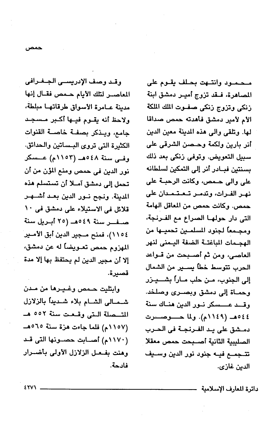 محمود وانتهت بحلف يقوم على المصاهرة، فقد تزوج أمير دمشق ابنة زنكى وتزوج زنكى صفوت الملك الملكة الأم لأمير دمشق فأهدته حمص صداقا لها. وتلقى والى هذه المدينة معين الدين أنر بارين ولكمة وحصن الشرقى على سبيل التعويض. وتوفى زنكى بعد ذلك بسنتين فبادر أنر إلى التمكين لسلطانه على والى حمص، وكانت الرحبة على نهر الفرات، وتدمر تعتمدان على حمص. وكانت حمص من المعاقل الهامة التى دار حولها الصراع مع الفرنجة، ومجمعًا لجنود المسلمين تحميها من الهجمات المباغتة الضفة اليمنى لنهر العاصى، ومن ثم أصبحت من قواعد الحرب تتوسط خطًا يسير من الشمال إلى الجنوب، من حلب مارًا بشيزر وحماة إلى دمشق وبصرى وصلخد. وقد عسكر نور الدين هناك سنة 544 هـ (1149 م). ولما حوصرت دمشق على يد الفرنجة فى الحرب الصليبية الثانية أصبحت حمص معقلا تتجمع فيه جنود نور الدين وسيف الدين غازى.