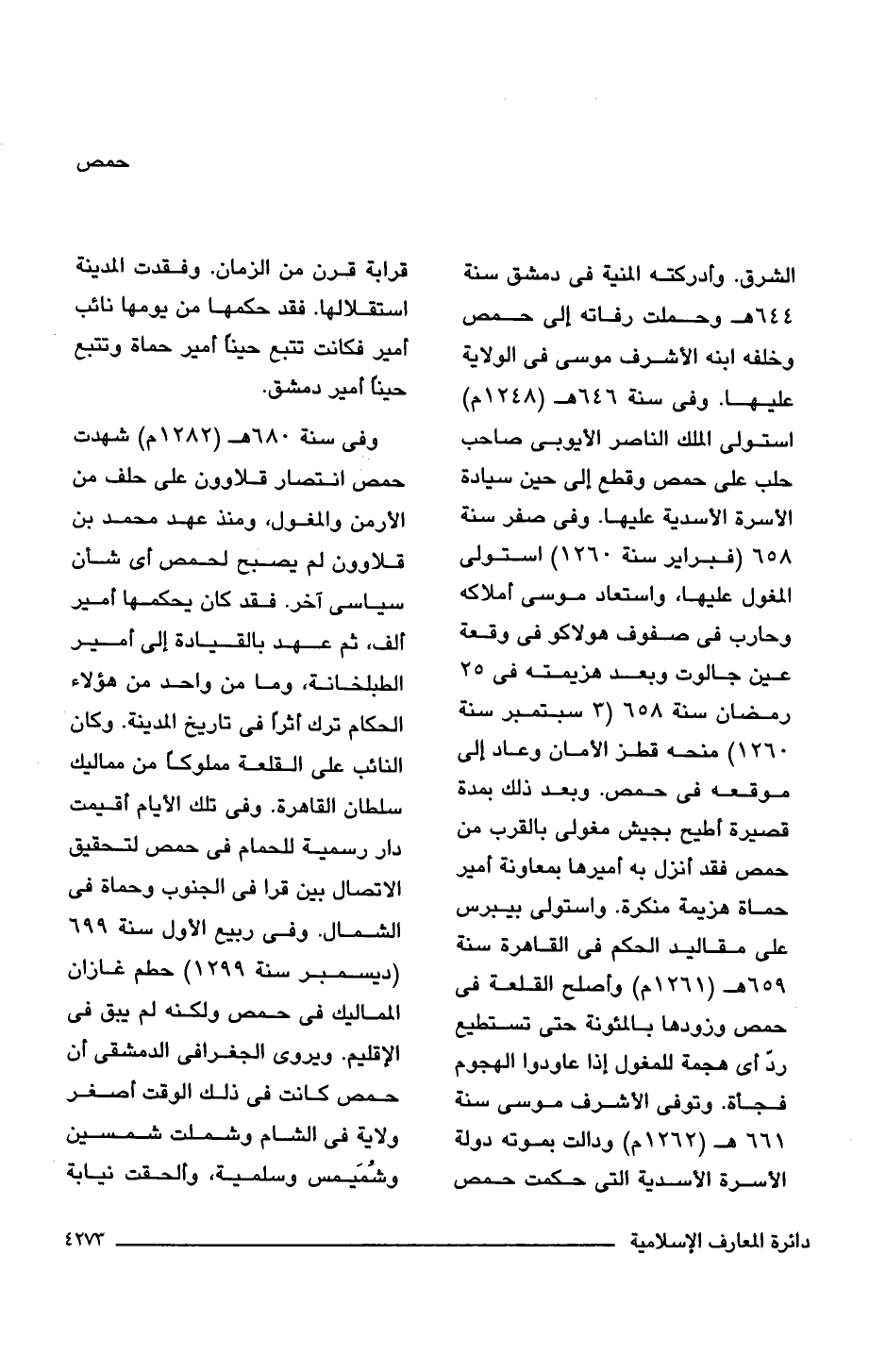 الشرق. وأدركته المنية فى دمشق سنة 644 هـ وحملت رفاته إلى حمص وخلفه ابنه الأشرف موسى فى الولاية عليها. وفى سنة 646 هـ (1248 م) استولى الملك الناصر الأيوبى صاحب حلب على حمص وقطع إلى حين سيادة الأسرة الأسدية عليها. وفى صفر سنة 658 (فبراير سنة 1260) استولى المغول عليها، واستعاد موسى أملاكه وحارب فى صفوف هولاكو فى وقعة عين جالوت وبعد هزيمته فى 25 رمضان سنة 658 (3 سبتمبر سنة 1260) منحه قطز الأمان وعاد إلى موقعه فى حمص. وبعد ذلك بمدة قصيرة أطيح بجيش مغولى بالقرب من حمص فقد أنزل به أميرها بمعاونة أمير حماة هزيمة منكرة. واستولى بيبرس على مقاليد الحكم فى القاهرة سنة 659 هـ (1261 م) وأصلح القلعة فى حمص وزودها بالمئونة حتى تستطيع ردّ أى هجمة للمغول إذا عاودوا الهجوم فجأة. وتوفى الأشرف موسى سنة 661 هـ (1262 م) ودالت بموته دولة الأسرة الأسدية التى حكمت حمص قرابة قرن من الزمان. وفقدت المدينة استقلالها. فقد حكمها من يومها نائب أمير فكانت تتبع حينًا أمير حماة وتتبع حينًا أمير دمشق.