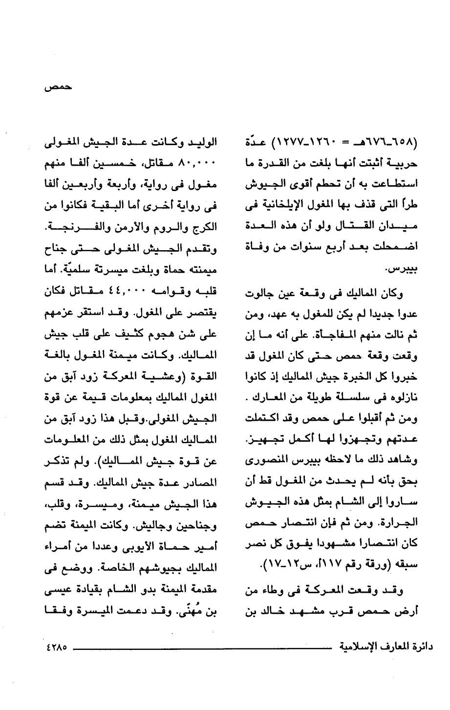 وكان المماليك فى وقعة عين جالوت عدوا جديدا لم يكن للمغول به عهد، ومن ثم نالت منهم المفاجأة. على أنه ما إن وقعت وقعة حمص حتى كان المغول قد خبروا كل الخبرة جيش المماليك إذ كانوا نازلوه فى سلسلة طويلة من المعارك. ومن ثم أقبلوا على حمص وقد اكتملت عدتهم وتجهزوا لها أكمل تجهيز. وشاهد ذلك ما لاحظه بيبرس المنصورى بحق بأنه لم يحدث من المغول قط أن ساروا إلى الشام بمثل هذه الجيوش الجرارة. ومن ثم فإن انتصار حمص كان انتصارا مشهودا يفوق كل نصر سبقه (ورقة رقم 117 أ، س 12 - 17).