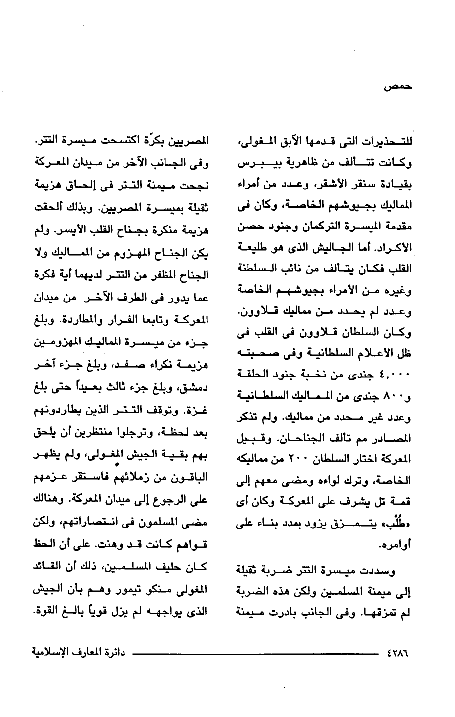 للتحذيرات التى قدمها الآبق المغولى، وكانت تتألف من ظاهرية بيبرس بقيادة سنقر الأشقر، وعدد من أمراء المماليك بجيوشهم الخاصة، وكان فى مقدمة الميسرة التركمان وجنود حصن الأكراد. أما الجاليش الذى هو طليعة القلب فكان يتألف من نائب السلطنة وغيره من الأمراء بجيوشهم الخاصة وعدد لم يحدد من مماليك قلاوون. وكان السلطان قلاوون فى القلب فى ظل الأعلام السلطانية وفى صحبته 4,000 جندى من نخبة جنود الحلقة و 800 جندى من المماليك السلطانية وعدد غير محدد من مماليك. ولم تذكر المصادر مم تألف الجناحان. وقبيل المعركة اختار السلطان 200 من مماليكه الخاصة، وترك لواءه ومضى معهم إلى قمة تل يشرف على المعركة وكان أى "طُلْب" يتمزق يزود بمدد بناء على أوامره.