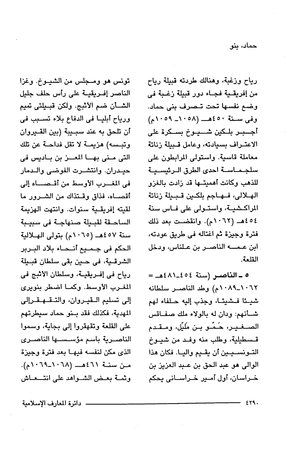 5 - الناصر (سنة 454 - 481 هـ = 1062 - 1089 م) وطد الناصر سلطانه شيئا فشيئا، وجذب إليه حلفاء لهم شأنهم: ودان له بالولاء ملك صفاقس الصغير, حَمّو بن مَليّل، ومقدم قسطيلية، وطلب منه وفد من شيوخ التونسيين أن يقيم واليا. فكان هذا الوالى هو عبد الحق بن عبد العزيز بن خراسان، أول أمير خراسانى يحكم تونس هو ومجلس من الشيوخ. وغزا الناصر إفريقية على رأس حلف جليل الشأن ضم الأثبج. ولكن قبيلتى تميم ورياح أبليا فى الدفاع بلاء تسبب فى أن تلحق به عند سبيبة (بين القيروان وتبسه) هزيمة لا تقل فداحة عن تلك التى منى بها المعز بن باديس فى حيدران. وانتشرت الفوضى والدمار فى المغرب الأوسط من أقصاه إلى أقصاه، فذاق وقتذاك من الشرور ما لقيته إفريقية سنوات. وانتهت الهزيمة الساحقة لقبيلة صنهاجة فى سبيبة سنة 457 هـ (1065 م) بتولى الهلالية الحكم فى جميع أنحاء بلاد البربر الشرقية، فى حين بقي سلطان قبيلة رياح فى إفريقية، وسلطان الأثبج فى المغرب الأوسط. وكما اضطر بنويرى إلى تسليم القيروان، والتقهقر إلى المهدية، فكذلك فقد بنو حماد سيطرتهم على القلعة وتقهقروا إلى بجاية، وسموا الناصرية باسم مؤسسها الناصرى الذى مكن لنفسه فيها بعد فترة وجيزة من سنة 461 هـ (1068 - 1069 م). وثمة بعض الشواهد على انتعاش