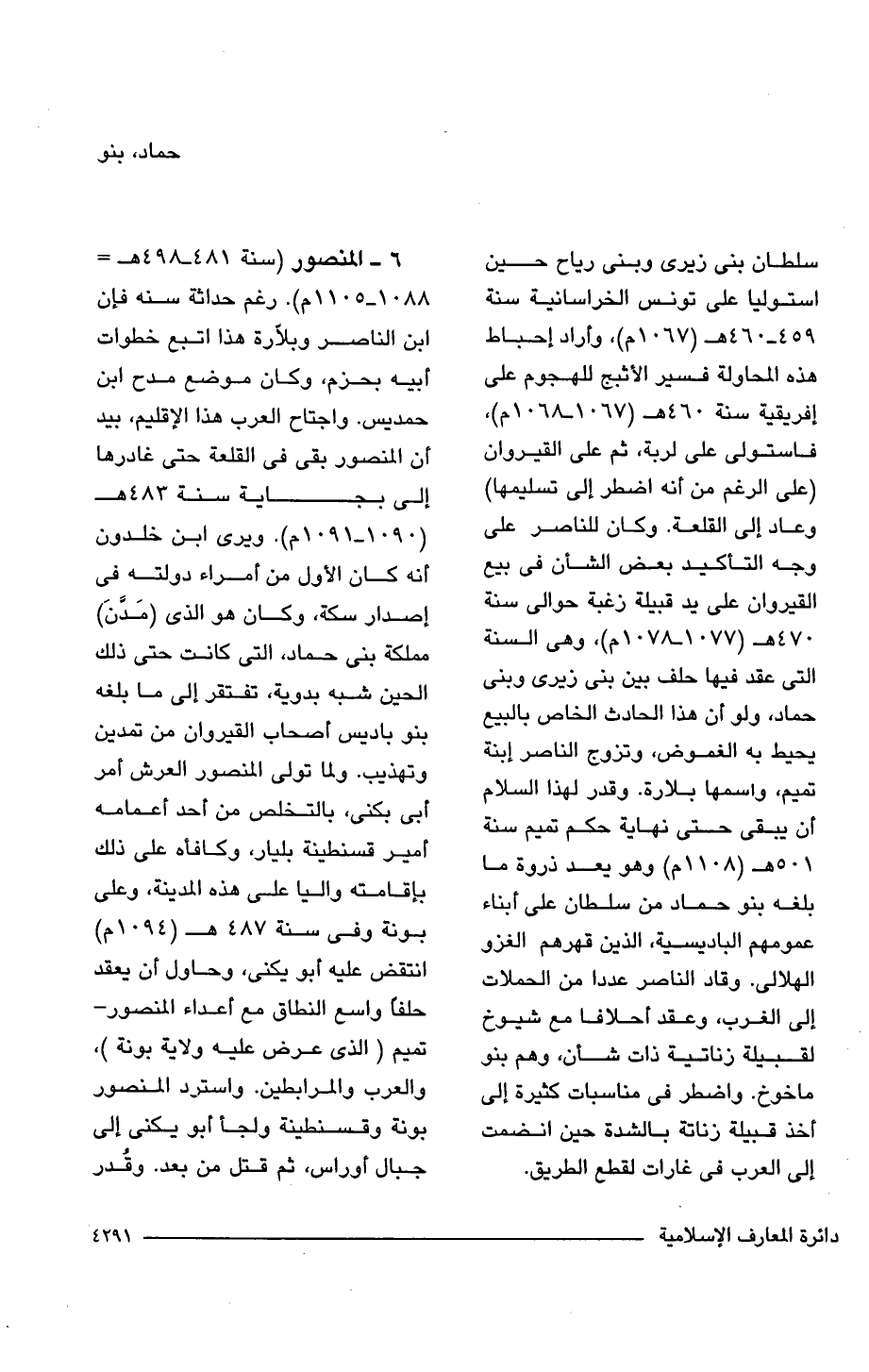 6 - المنصور (سنة 481 - 498 هـ = 1088 - 1105 م). رغم حداثة سنه فإن ابن الناصر وبلّارة هذا اتبع خطوات أبيه بحزم، وكان موضع مدح ابن حمديس. واجتاح العرب هذا الإقليم، بيد إن المنصور بقى فى القلعة حتى غادرها إلى بجاية سنة 483 هـ (1090 - 1091 م). ويرى ابن خلدون أنه كان الأول من أمراء دولته فى إصدار سكة، وكان هو الذى (مَدَّنَ) مملكة بنى حماد، التى كانت حتى ذلك الحين شبه بدوية، تفتقر إلى ما بلغه بنو باديس أصحاب القيروان من تمدين وتهذيب. ولما تولى المنصور العرش أمر أبى بكنى، بالتخلص من أحد أعمامه أمير قسنطينة بليار، وكافأه على ذلك بإقامته واليا على هذه المدينة، وعلى بونة وفى سنة 487 هـ (1094 م) انتقض عليه أبو يكنى، وحاول أن يعقد حلفًا واسع النطاق مع أعداء المنصور - تميم (الذى عرض عليه ولاية بونة)، والعرب والمرابطين. واسترد المنصور بونة وقسنطينة ولجأ أبو يكنى إلى جبال أوراس، ثم قتل من بعد. وقُدر
