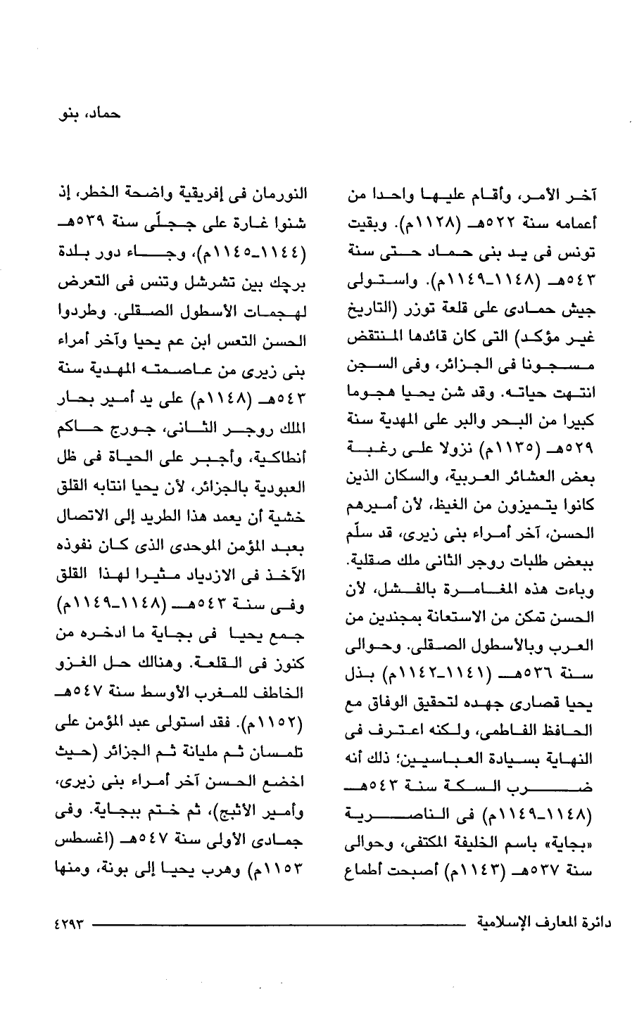 آخر الأمر، وأقام عليها واحدا من أعمامه سنة 522 هـ (1128 م). وبقيت تونس فى يد بنى حماد حتى سنة 543 هـ (1148 - 1149 م). واستولى جيش حمادى على قلعة توزر (التاريخ غير مؤكد) التى كان قائدها المنتقض مسجونا فى الجزائر، وفى السجن انتهت حياته. وقد شن يحيا هجوما كبيرًا من البحر والبر على المهدية سنة 529 هـ (1135 م) نزولا على رغبة بعض العشائر العربية، والسكان الذين كانوا يتميزون من الغيظ, لأن أميرهم الحسن، آخر أمراء بنى زيرى، قد سلّم ببعض طلبات روجر الثاني ملك صقلية. وباءت هذه المغامرة بالفشل, لأن الحسن تمكن من الاستعانة بمجندين من العرب وبالأسطول الصقلى. وحوالى سنة 536 هـ (1141 - 1142 م) بذل يحيا قصارى جهده لتحقيق الوفاق مع الحافظ الفاطمى، ولكنه اعترف فى النهاية بسيادة العباسيين؛ ذلك أنه ضرب السكة سنة 543 هـ (1148 - 1149 م) فى الناصرية "بجاية" باسم الخليفة المكتفى، وحوالى سنة 537 هـ (1143 م) أصبحت أطماع النورمان فى إفريقية واضحة الخطر، إذ شنوا غارة على ججلّى سنة 539 هـ (1144 - 1145 م)، وجاء دور بلدة برجك بين تشرشل وتنس فى التعرض لهجمات الأسطول الصقلى. وطردوا الحسن التعس ابن عم يحيا وآخر أمراء بنى زيرى من عاصمته المهدية سنة 543 هـ (1148 م) على يد أمير بحار الملك روجر الثاني، جورج حاكم أنطاكية، وأجبر على الحياة فى ظل العبودية بالجزائر, لأن يحيى انتابه القلق خشية أن يعمد هذا الطريد إلى الاتصال بعبد المؤمن الموحدى الذى كان نفوذه الآخذ فى الازدياد مثيرا لهذا القلق وفى سنة 543 هـ (1148 - 1149 م) جمع يحيا فى بجاية ما ادخره من كنوز فى القلعة. وهنالك حل الغزو الخاطف للمغرب الأوسط سنة 547 هـ (1152 م). فقد استولى عبد المؤمن على تلمسان ثم مليانة ثم الجزائر (حيث اخضع الحسن آخر أمراء بنى زيرى، وأمير الأثبج)، ثم ختم ببجاية. وفى جمادى الأولى سنة 547 هـ (اغسطس 1153 م) وهرب يحيا إلى بونة، ومنها