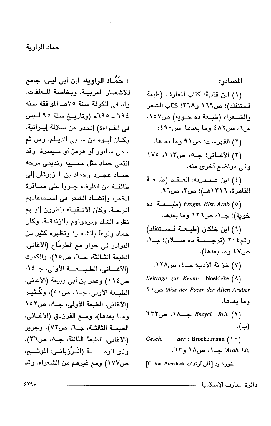 + حَمَّاد الراوية، ابن أبي ليلى، جامع للأشعار العربية، وبخاصة المعلقات. ولد فى الكوفة سنة 75 هـ الموافقة سنة 694 - 695 م (وتاريخ سنة 95 لبس فى القراءة) إنحدر من سلالة إيرانية، وكان أبوه من سبى الديلم، ومن ثم سمى سابور أو هرمز أو ميسرة. وقد انتمى حماد مثل سمييه ونديمى مرحه حماد عجرد وحماد بن الزبرقان إلى طائفة من الظرفاء جروا على معاقرة الخمر، وإنشاد الشعر فى اجتماعاتهم المرحة. وكان الأتقياء ينظرون إليهم نظرة الشك ويرمونهم بالزندقة. وكان حماد ولوعًا بالشعر؛ وتظهره كثير من النوادر فى حوار مع الطرمّاح (الأغانى، الطبعة الثالثة، جـ 6، ص 95)، والكميت (الأغانى، الطبعة الأولى، جـ 14، ص 114) وعمر بن أبي ربيعة (الأغانى، الطبعة الأولى، جـ 1، ص 50)، وكُثير (الأغانى، الطبعة الأولى، جـ 8، ص 152 وما بعدها)، ومع الفرزدق (الأغانى، الطبعة الثالثة، جـ 6، ص 73)، وجرير (الأغانى، الطبعة الثالثة، جـ 8، ص 36)، وذى الرمة (المَرْزبانى: الموشح، ص 177) ومع غيرهم من الشعراء. وقد