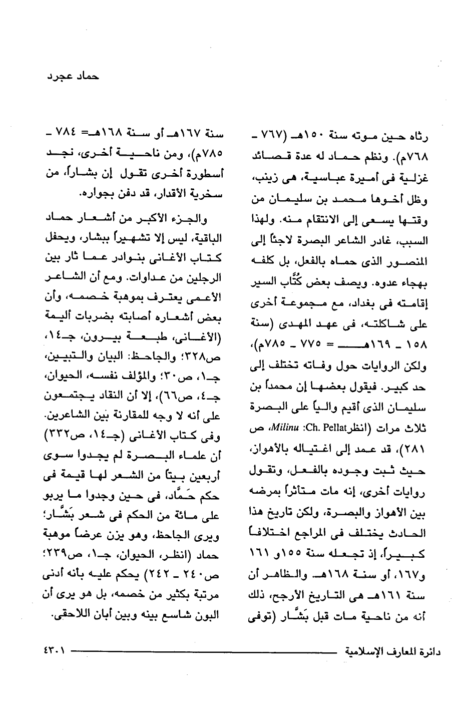 رثاه حين موته سنة 150 هـ (767 - 768 م). ونظم حماد له عدة قصائد غزلية فى أميرة عباسية، هى زينب، وظل أخوها محمد بن سليمان من وقتها يسعى إلى الانتقام منه. ولهذا السبب، غادر الشاعر البصرة لاجئًا إلى المنصور الذى حماه بالفعل، بل كلفه بهجاء عدوه. ويصف بعض كُتَّاب السير إقامته فى بغداد، مع مجموعة أخرى على شاكلته، فى عهد المهدي (سنة 158 - 169 هـ = 775 - 785 م)، ولكن الروايات حول وفاته تختلف إلى حد كبير. فيقول بعضها إن محمدًا بن سليمان الذى أقيم واليًا على البصرة ثلاث مرات (انظر Milinu: Ch. Pellat, ص 281)، قد عمد إلى اغتياله بالأهواز، حيث ثبت وجوده بالفعل، وتقول روايات أخرى، إنه مات متأثرًا بمرضه بين الأهواز والبصرة، ولكن تاريخ هذا الحادث يختلف فى المراجع اختلافًا كبيرًا، إذ تجعله سنة 155 و 161 و 167, أو سنة 168 هـ. والظاهر أن سنة 161 هـ هى التاريخ الأرجح، ذلك أنه من ناحية مات قبل بَشَّار (توفى سنة 167 هـ أو سنة 168 هـ = 784 - 785 م)، ومن ناحية أخرى، نجد أسطورة أخرى تقول إن بشارًا، من سخرية الأقدار، قد دفن بجواره.