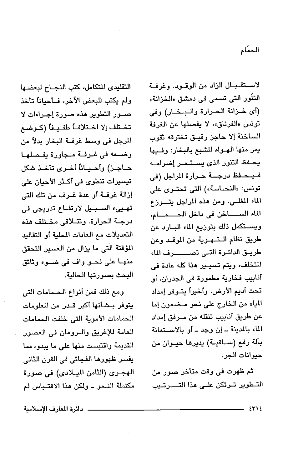 لاستقبال الزاد من الوقود. وغرفة التنّور التى تسمى فى دمشق "الخزانة" (أى خزانة الحرارة والبخار) وفى تونس "الفرناق"، لا يفصلها عن الغرفة الساخنة إلَّا حاجز رقيق تخترقه ثقوب يمر منها الهواء المشبع بالبخار: وفيها يحفظ التنور الذى يستمر إضرامه فيحفظ درجة حرارة المراجل (فى تونس: "النحاسة") التى تحتوى على الماء المغلى. ومن هذه المراجل يتوزع الماء الساخن فى داخل الحمام، ويستكمل ذلك بتوزيع الماء البارد عن طريق نظام التهوية من الموقد وعن طريق الدائرة التى تصرف الماء المتخلف، ويتم تسيير هذا كله عادة فى أنابيب فخارية مطمورة فى الجدران، أو تحت أديم الأرض. وأخيرًا يتوفر إمداد المياه من الخارج على نحو مضمون إما عن طريق أنابيب تنقله من مرفق إمداد الماء بالمدينة - إن وجد - أو بالاستعانة بآلة رفع (ساقية) يديرها حيوان من حيوانات الجر.