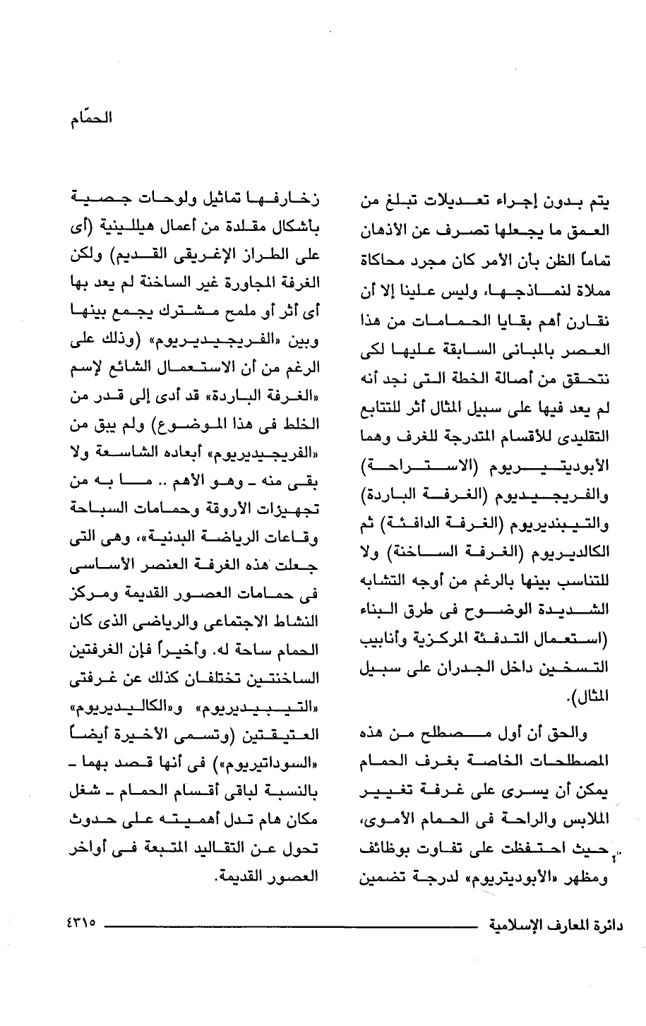 يتم بدون إجراء تعديلات تبلغ من العمق ما يجعلها تصرف عن الأذهان تمامًا الظن بأن الأمر كان مجرد محاكاة مملاة لنماذجها, وليس علينا إلَّا أن نقارن أهم بقايا الحمامات من هذا العصر بالمبانى السابقة عليها لكى نتحقق من أصالة الخطة التى نجد أنه لم يعد فيها على سبيل المثال أثر للتتابع التقليدى للأقسام المتدرجة للغرف وهما الأبوديتيريوم (الاستراحة) والفريجيديوم (الغرفة الباردة) والتيبنديريوم (الغرفة الدافئة) ثم الكالديريوم (الغرفة الساخنة) ولا للتناسب بينها بالرغم من أوجه التشابه الشديدة الوضوح فى طرق البناء (استعمال التدفئة المركزية وأنابيب التسخين داخل الجدران على سبيل المثال).