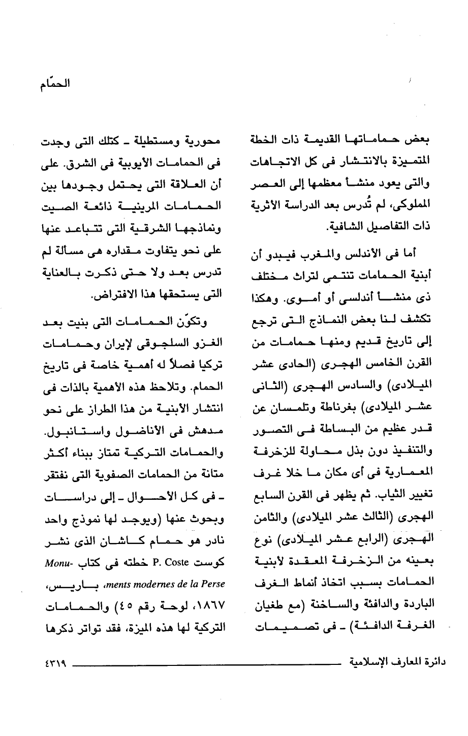 وتكوّن الحمامات التى بنيت بعد الغزو السلجوقى لإيران وحمامات تركيا فصلًا له أهمية خاصة فى تاريخ الحمام. وتلاحظ هذه الأهمية بالذات فى انتشار الأبنية من هذا الطراز على نحو مدهش فى الأناضول واستانبول. والحمامات التركية تمتاز ببناء أكثر متانة من الحمامات الصفوية التى نفتقر - فى كل الأحوال - إلى دراسات وبحوث عنها (ويوجد لها نموذج واحد نادر هو حمام كاشان الذى نشر كوست P. Coste خطته فى كتاب Monu- ments modernes de la Perse, باريس، 1867, لوحة رقم 45) والحمامات التركية لها هذه الميزة، فقد تواتر ذكرها