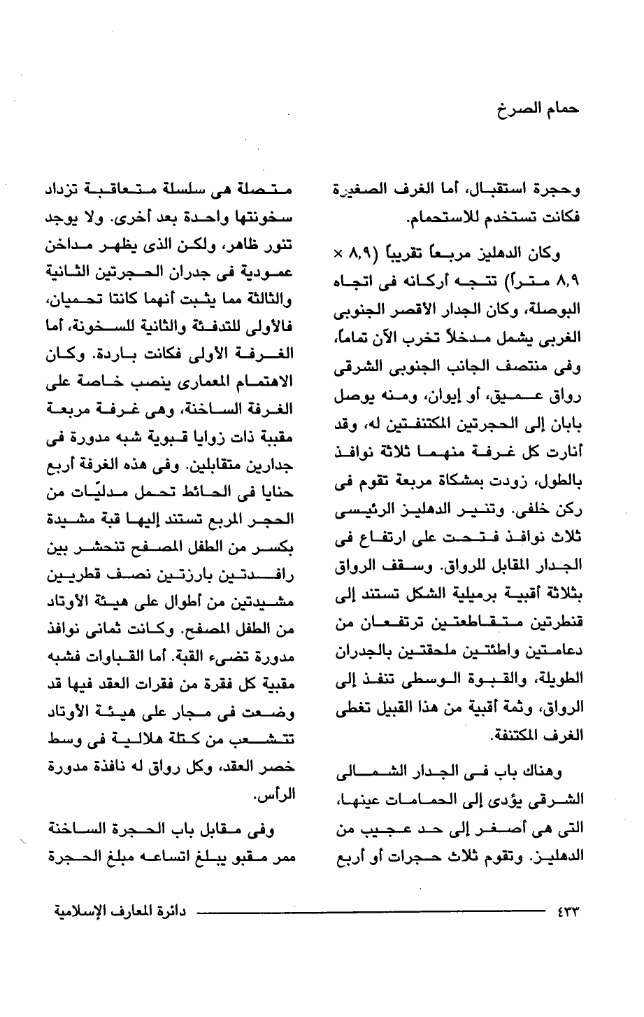 وهناك باب فى الجدار الشمالى الشرقى يؤدى إلى الحمامات عينها، التى هى أصغر إلى حد عجيب من الدهليز. وتقوم ثلاث حجرات أو أربع متصلة هى سلسلة متعاقبة تزداد سخونتها واحدة بعد أخرى. ولا يوجد تنور ظاهر، ولكن الذى يظهر مداخن عمودية فى جدران الحجرتين الثانية والثالثة مما يثبت أنهما كانتا تحميان، فالأولى للتدفئة والثانية للسخونة، أما الغرفة الأولى فكانت باردة. وكان الاهتمام المعمارى ينصب خاصة على الغرفة الساخنة، وهى غرفة مربعة مقببة ذات زوايا قبوية شبه مدورة فى جدارين متقابلين. وفى هذه الغرفة أربع حنايا فى الحائط تحمل مدليّات من الحجر المربع تستند إليها قبة مشيدة بكسر من الطفل المصفح تنحشر بين رافدتين بارزتين نصف قطريين مشيدتين من أطوال على هيئة الأوتاد من الطفل المصفح. وكانت ثماني نوافذ مدورة تضئ القبة. أما القباوات فشبه مقبية كل فقرة من فقرات العقد فيها قد وضعت فى مجار على هيئة الأوتاد تتشعب من كتلة هلالية فى وسط خصر العقد، وكل رواق له نافذة مدورة الرأس.
