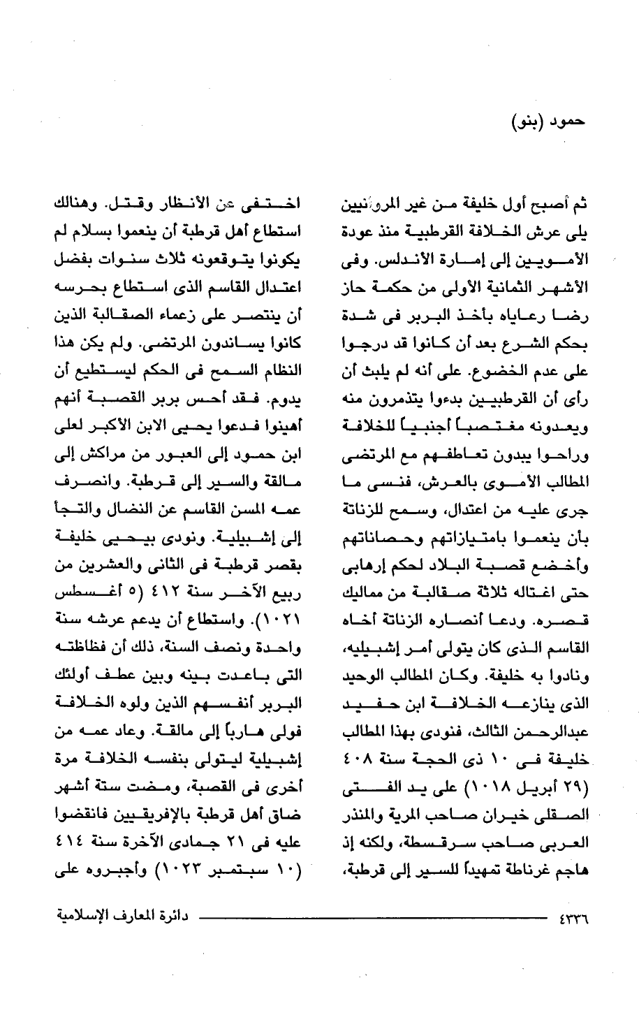 ثم أصبح أول خليفة من غير المروانيين يلى عرش الخلافة القرطبية منذ عودة الأمويين إلى إمارة الأندلس. وفى الأشهر الثمانية الأولى من حكمة حاز رضا رعاياه بأخذ البربر فى شدة بحكم الشرع بعد أن كانوا قد درجوا على عدم الخضوع. على أنه لم يلبث أن رأى أن القرطبيين بدءوا يتذمرون منه ويعدونه مغتصبًا أجنبيًا للخلافة وراحوا يبدون تعاطفهم مع المرتضى المطالب الأموى بالعرش، فنسى ما جرى عليه من اعتدال، وسمح للزناتة بأن ينعموا بامتيازاتهم وحصاناتهم وأخضع قصبة البلاد لحكم إرهابى حتى اغتاله ثلاثة صقالبة من مماليك قصره. ودعا أنصاره الزناتة أخاه القاسم الذى كان يتولى أمر إشبيليه، ونادوا به خليفة. وكان المطالب الوحيد الذى ينازعه الخلافة ابن حفيد عبد الرحمن الثالث، فنودى بهذا المطالب خليفة فى 10 ذى الحجة سنة 408 (29 أبريل 1018) على يد الفتى الصقلى خيران صاحب المرية والمنذر العربى صاحب سرقسطة، ولكنه إذ هاجم غرناطة تمهيدًا للسير إلى قرطبة، اختفى عن الأنظار وقتل. وهنالك استطاع أهل قرطبة أن ينعموا بسلام لم يكونوا يتوقعونه ثلاث سنوات بفضل اعتدال القاسم الذى استطاع بحرسه أن ينتصر على زعماء الصقالبة الذين كانوا يساندون المرتضى. ولم يكن هذا النظام السمح فى الحكم ليستطيع أن يدوم. فقد أحس بربر القصبة أنهم أهينوا فدعوا يحيى الابن الأكبر لعلى ابن حمود إلى العبور من مراكش إلى مالقة والسير إلى قرطبة. وانصرف عمه المسن القاسم عن النضال والتجأ إلى إشبيلية. ونودى بيحيى خليفة بقصر قرطبة فى الثانى والعشرين من ربيع الآخر سنة 412 (5 أغسطس 1021). واستطاع أن يدعم عرشه سنة واحدة ونصف السنة، ذلك أن فظاظته التى باعدت بينه وبين عطف أولئك البربر أنفسهم الذين ولوه الخلافة فولى هاربًا إلى مالقة. وعاد عمه من إشبيلية ليتولى بنفسه الخلافة مرة أخرى فى القصبة، ومضت ستة أشهر ضاق أهل قرطبة بالإفريقيين فانقضوا عليه فى 21 جمادى الآخرة سنة 414 (10 سبتمبر 1023) وأجبروه على