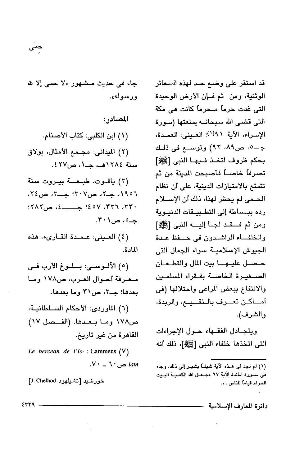 قد استقر على وضع حد لهذه الشعائر الوثنية، ومن ثم فإن الأرض الوحيدة التى غدت حرمًا محرمًا كانت هي مكة التى قضى الله سبحانه بمنعتها (سورة الإسراء، الآية 91 (¬1)؛ العيني: العمدة، جـ 5، ص 89, 92) وتوسع فى ذلك بحكم ظروف اتخذ فيها النبي [- صلى الله عليه وسلم -] تصرفًا خاصًا فأصبحت المدينة من ثم تتمتع بالامتيازات الدينية، على أن نظام الحمى لم يحظر لهذا، ذلك أن الإِسلام رده ببساطة إلى التطبيقات الدنيوية ومن ثم فقد لجأ إليه النبي [- صلى الله عليه وسلم -] والخلفاء الراشدون فى حفظ عدة الجيوش الإِسلامية سواء الجمال التى حصل عليها بيت المال والقطعان الصغيرة الخاصة بفقراء المسلمين والانتفاع ببعض المراعى واحتلالها (فى أماكن تعرف بالنقيع، والربدة، والشرف).