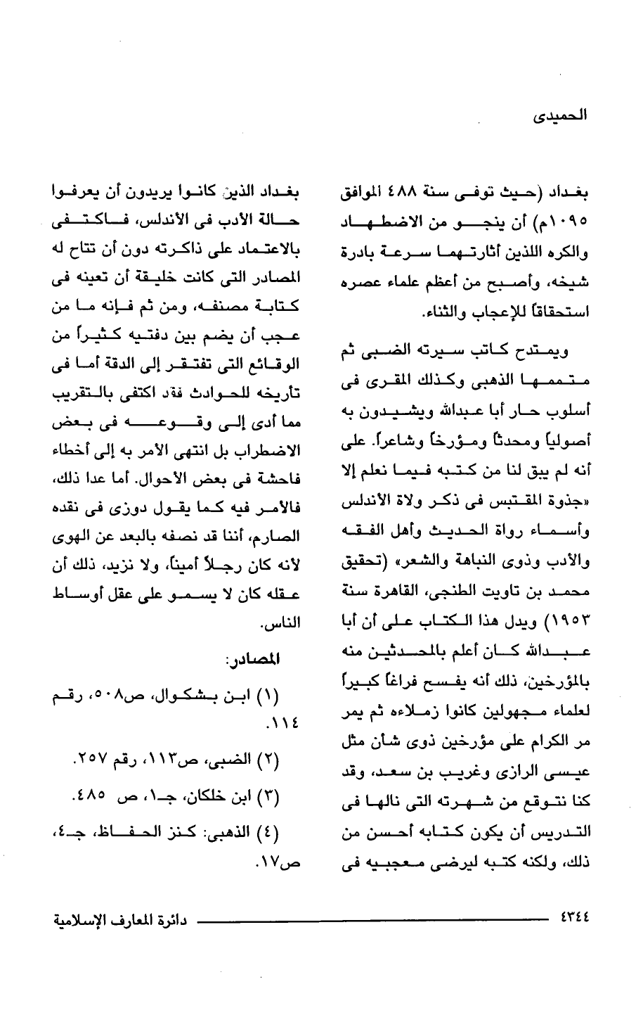 ويمتدح كاتب سيرته الضبى ثم متممها الذهبي وكذلك المقرى فى أسلوب حار أبا عبد الله ويشيدون به أصوليًا ومحدثًا ومؤرخًا وشاعرًا. على أنه لم يبق لنا من كتبه فيما نعلم إلَّا "جذوة المقتبس فى ذكر ولاة الأندلس وأسماء رواة الحديث وأهل الفقه والأدب وذوى النباهة والشعر" (تحقيق محمد بن تاويت الطنجى، القاهرة سنة 1953) ويدل هذا الكتاب على أن أَبا عبد الله كان أعلم بالمحدثين منه بالمؤرخين، ذلك أنه يفسح فراغًا كبيرًا لعلماء مجهولين كانوا زملاءه ثم يمر مر الكرام على مؤرخين ذوى شأن مثل عيسى الرازى وغريب بن سعد، وقد كنا نتوقع من شهرته التى نالها فى التدريس أن يكون كتابه أحسن من ذلك، ولكنه كتبه ليرضى معجبيه فى بغداد الذين كانوا يريدون أن يعرفوا حالة الأدب فى الأندلس، فاكتفى بالاعتماد على ذاكرته دون أن تتاح له المصادر التى كانت خليقة أن تعينه فى كتابة مصنفه، ومن ثم فإنه ما من عجب أن يضم بين دفتيه كثيرًا من الوقائع التى تفتقر إلى الدقة أما فى تأريخه للحوادث فقد اكتفى بالتقريب مما أدى إلى وقوعه فى بعض الاضطراب بل انتهى الأمر به إلى أخطاء فاحشة فى بعض الأحوال. أما عدا ذلك، فالأمر فيه كما يقول دوزى فى نقده الصارم، أننا قد نصفه بالبعد عن الهوى لأنه كان رجلًا أمينًا, ولا نزيد، ذلك أن عقله كان لا يسمو على عقل أوساط الناس.