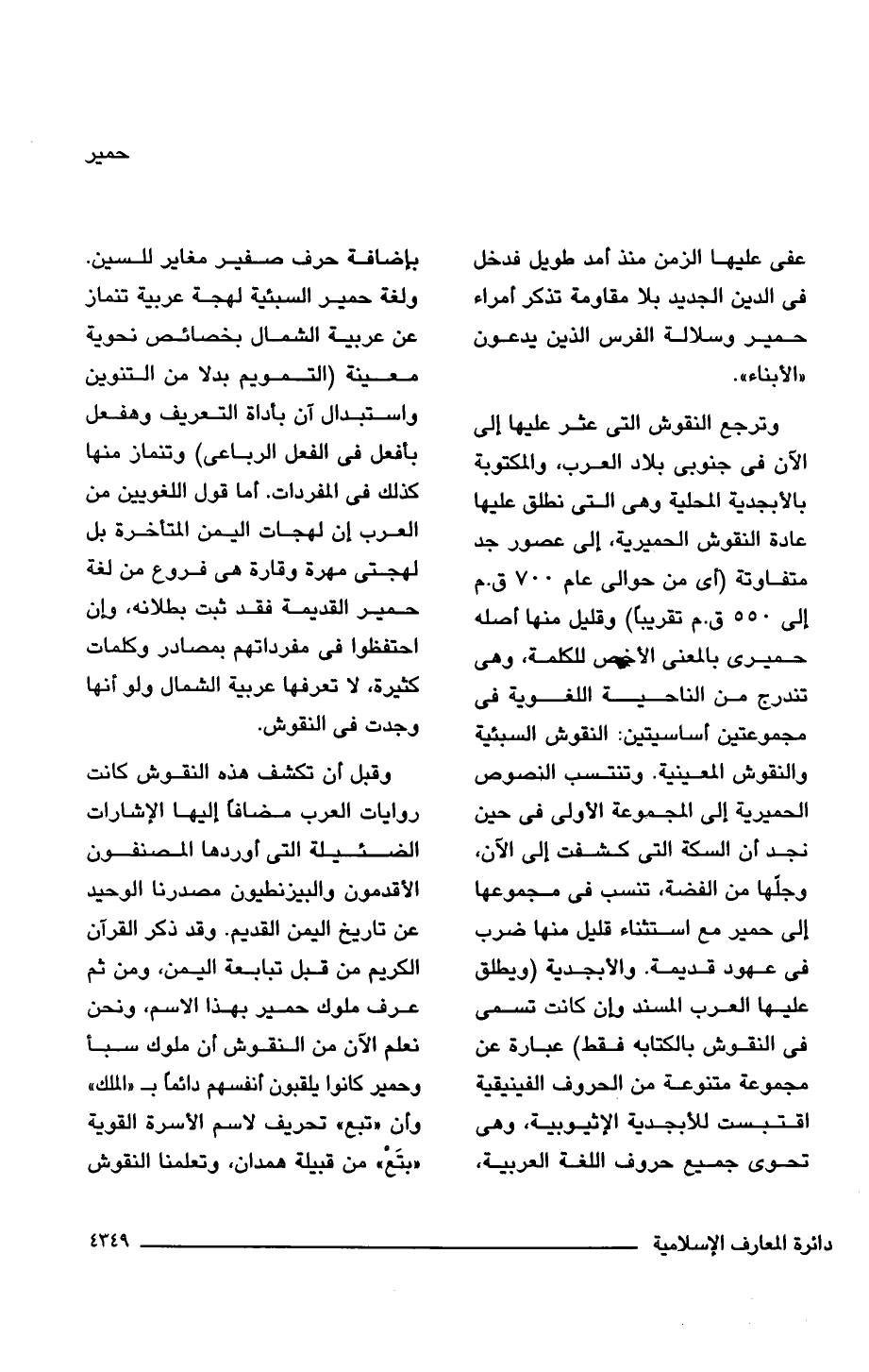 وترجع النقوش التى عثر عليها إلى الآن فى جنوبى بلاد العرب، والمكتوبة بالأبجدية المحلية وهي التى نطلق عليها عادة النقوش الحميرية، إلى عصور جد متفاوتة (أى من حوالى عام 700 ق. م إلى 550 ق. م تقريبًا) وقليل منها أصله حميرى بالمعنى الأخص للكلمة، وهى تندرج من الناحية اللغوية فى مجموعتين أساسيتين: النقوش السبئية والنقوش المعينية. وتنتسب النصوص الحميرية إلى المجموعة الأولى فى حين نجد أن السكة التى كشفت إلى الآن، وجلّها من الفضة، تنسب فى مجموعها إلى حمير مع استثناء قليل منها ضرب فى عهود قديمة. والأبجدية (ويطلق عليها العرب المسند وإن كانت تسمى فى النقوش بالكتابه فقط) عبارة عن مجموعة متنوعة من الحروف الفينيقية اقتبست للأبجدية الإثيوبية، وهى تحوى جميع حروف اللغة العربية، بإضافة حرف صفير مغاير للسين. ولغة حمير السبئية لهجة عربية تنماز عن عربية الشمال بخصائص نحوية معينة (التمويم بدلا من التنوين واستبدال آن بأداة التعريف وهفعل بأفعل فى الفعل الرباعى) وتنماز منها كذلك فى المفردات. أما قول اللغويين من العرب إن لهجات اليمن المتأخرة بل لهجتى مهرة وقارة هي فروع من لغة حمير القديمة فقد ثبت بطلانه، وإن احتفظوا فى مفرداتهم بمصادر وكلمات كثيرة، لا تعرفها عربية الشمال ولو أنها وجدت فى النقوش.