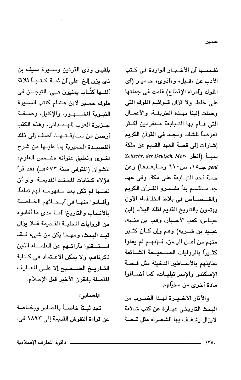 نفسها أن الأخبار الواردة فى كتب الأدب عن "قيل" و"أذوى" حمير (أى الملوك وأمراء الإقطاع) قامت فى جملتها على خلط. ولا تزال قوائم الملوك التى وصلت إلينا بهذه الطريقة، والأعمال التى قام بها التبابعة منفردين أكثر تعرضًا للشك. ونجد فى القرآن الكريم إشارات إلى قصة العهد القديم عن ملكة سبأ (انظر - Zeitschr, der Deutsch. Mor genl جـ 15، ص 610 وما بعدها) وعن حملة أحد التبابعة على مكة. وفى عهد جد متقدم بدأ مفسرو القرآن الكريم والقصاص فى بلاط الخلفاء الأول يهتمون بالتاريخ القديم لتلك البلاد (ابن عباس، كعب الأحبار، وهب بن منبه، عبيد بن شريه) وهم وإن كان كثير منهم من أهل اليمن، فإنهم لم يعنوا كثيرًا بالروايات الصحيحة الشائعة عنايتهم بالأساطير الدخيلة مثل قصة الإسكندر والإسرائيليات، كما أضافوا مادة أخرى من مخيّلهم.