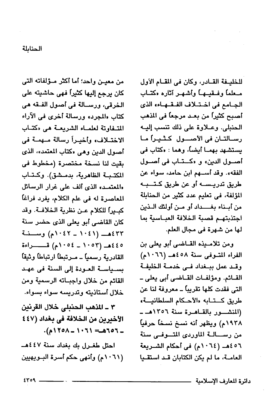 ومن تلاميذه القاضى أبو يعلى بن الفراء المتوفى سنة 458 هـ (1066 م) وقد عمل ببغداد فى خدمة الخليفة القائم. ومؤلفات القاضى أبى يعلى - التى فقدت كلها تقريبًا - معروفة لنا عن طريق كتابه "الأحكام السلطانية" (المنشور بالقاهرة سنة 1356 هـ - 1938 م) ويظهر أنه نسخ نسخًا حرفيًا من رسالة الماوردى المتوفى سنة 456 هـ (1064 م) فى أحكام الشريعة العامة، ما لم يكن الكتابان قد استقيا من معين واحد؛ أما أكثر مؤلفاته التى كان يرجع إليها كثيرًا فهى حاشيته على الخرقى، ورسالة فى أصول الفقه هى كتاب "المجرد" ورسالة أخرى فى الآراء المتفاوتة لعلماء الشريعة هى "كتاب الاختلاف" وأخيرًا رسالة مهمة فى أصول الدين وهى "كتاب المعتمد"، الذى بقيت لنا نسخة مختصرة (مخطوط فى المكتبة الظاهرية، بدمشق). وكتاب "المعتمد" الذى ألف على غرار الرسائل المعاصرة له فى علم الكلام، يفرد فراغًا كبيرًا للكلام عن نظرية الخلافة. وقد كان القاضى أبو يعلى الذى حضر سنة 433 هـ (1041 - 1042 م) وسنة 445 هـ (1053 - 1054 م) قراءة القادرية رسميًا - مرتبطًا ارتباطًا وثيقًا بسياسة العودة إلى السنة فى عهد القائم من خلال واجباته الرسمية ومن خلال أستاذيته وتدريسه سواء بسواء.