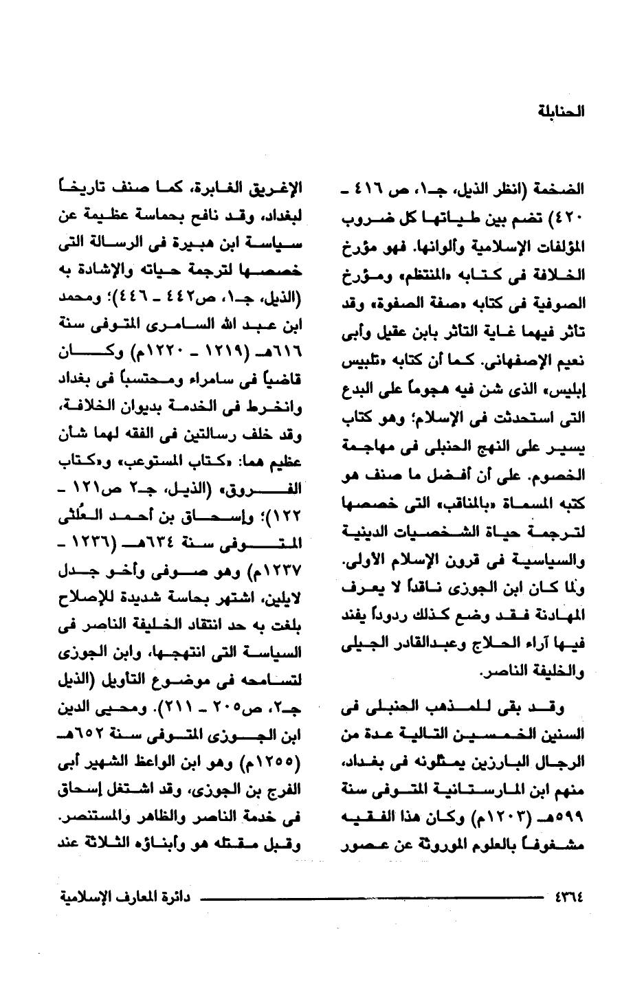 الضخمة (انظر الذيل، جـ 1، ص 416 - 420) تضم بين طياتها كل ضروب المؤلفات الإِسلامية وألوانها. فهو مؤرخ الخلافة فى كتابه "المنتظم" ومؤرخ الصوفية فى كتابه "صفة الصفوة" وقد تأثر فيهما غاية التأثر بابن عقيل وأبى نعيم الإصفهانى. كما أن كتابه "تلبيس إبليس" الذى شن فيه هجومًا على البدع التى استحدثت فى الإِسلام؛ وهو كتاب يسير على النهج الحنبلى فى مهاجمة الخصوم. على أن أفضل ما صنف هو كتبه المسماة "بالمناقب" التى خصصها لترجمة حياة الشخصيات الدينية والسياسية فى قرون الإِسلام الأولى. ولما كان ابن الجوزى ناقدًا لا يعرف المهادنة فقد وضع كذلك ردودًا يفند فيها آراء الحلاج وعبد القادر الجيلى والخليفة الناصر.