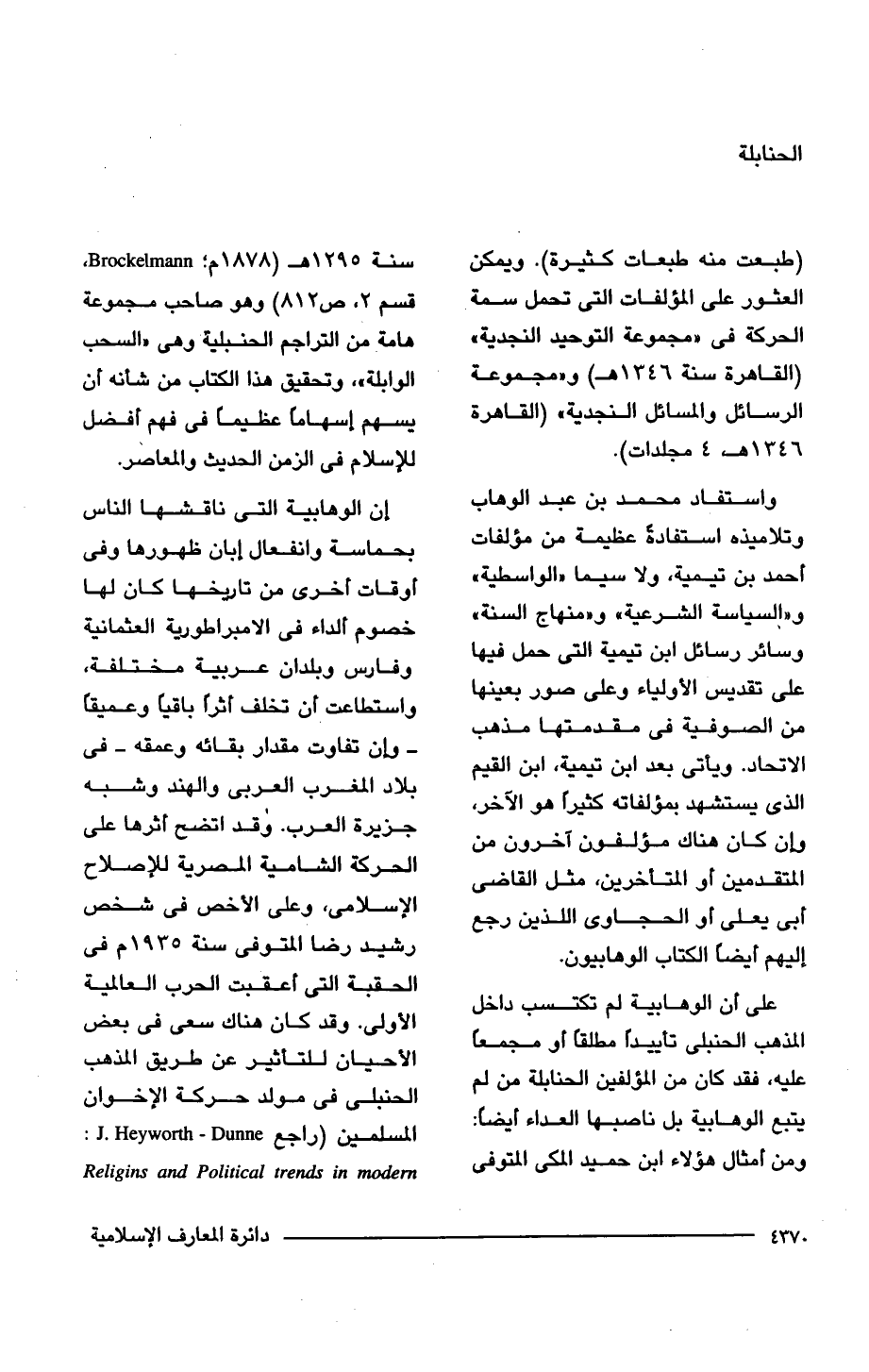 إن الوهابية التى ناقشها الناس بحماسة وانفعال إبان ظهورها وفى أوقات أخرى من تاريخها كان لها خصوم ألداء فى الامبراطورية العثمانية وفارس وبلدان عربية مختلفة، واستطاعت أن تخلف أثرًا باقيًا وعميقًا - وإن تفاوت مقدار بقائه وعمقه - فى بلاد المغرب العربى والهند وشبه جزيرة العرب. وقد اتضح أثرها على الحركة الشامية المصرية للإصلاح الإِسلامى، وعلى الأخص فى شخص رشيد رضا المتوفى سنة 1935 م فى الحقبة التى أعقبت الحرب العالمية الأولى. وقد كان هناك سعى فى بعض الأحيان للتأثير عن طريق المذهب الحنبلى فى مولد حركة الإخوان المسلمين (راجع J. Heyworth - Dunne: Religins and Political trends in modern