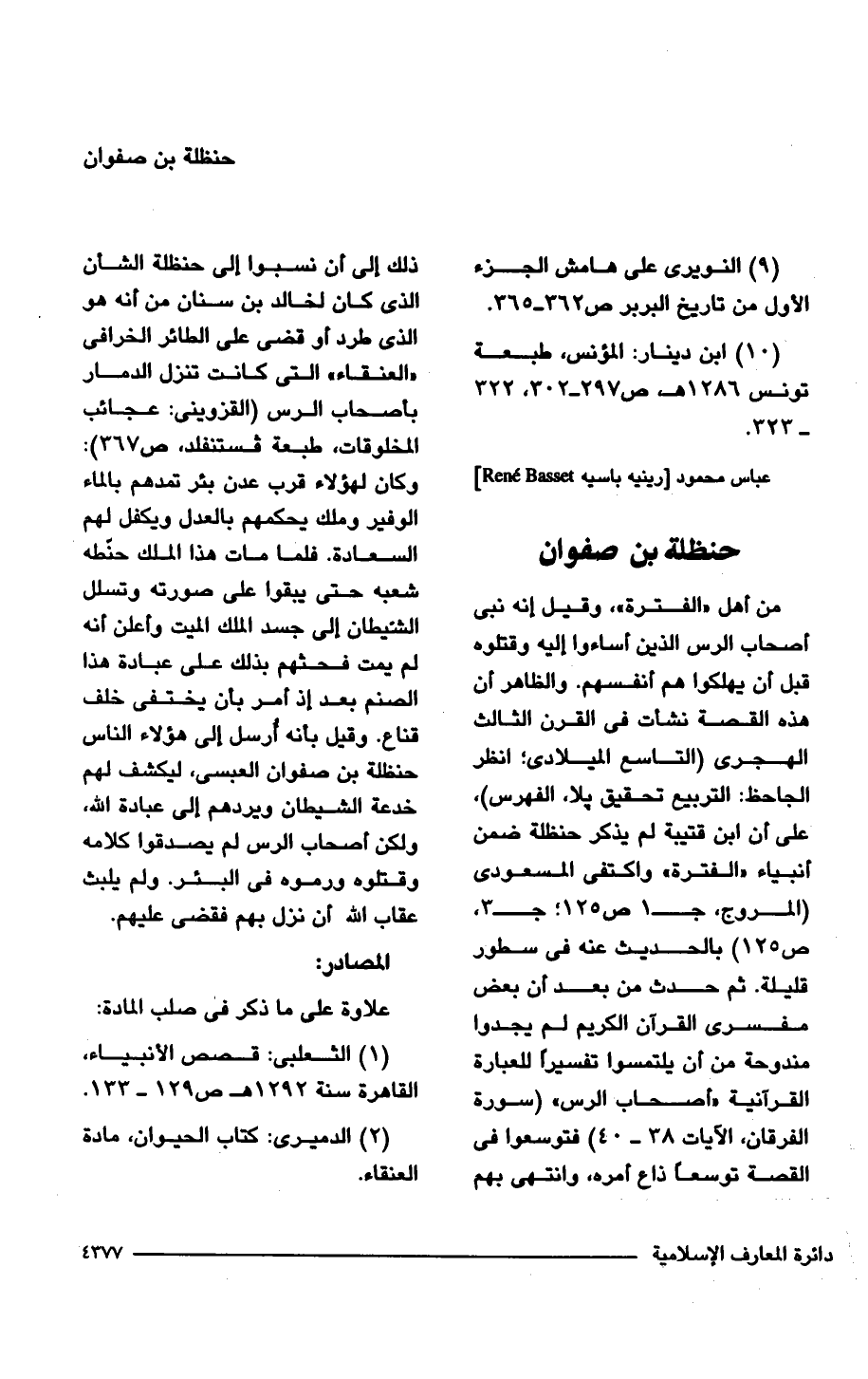 من أهل "الفترة"، وقيل أنه نبى أصحاب الرس الذين أساءوا إليه وقتلوه قبل أن يهلكوا هم أنفسهم. والظاهر أن هذه القصة نشأت فى القرن الثالث الهجرى (التاسع الميلادى؛ انظر الجاحظ: التربيع تحقيق بلا, الفهرس)، على أن ابن قتيبة لم يذكر حنظلة ضمن أنبياء "الفترة" واكتفى المسعودى (المروج، جـ 1 ص 125؛ جـ 3، ص 125) بالحديث عنه فى سطور قليلة. ثم حدث من بعد أن بعض مفسرى القرآن الكريم لم يجدوا مندوحة من ان يلتمسوا تفسيرًا للعبارة القرآنية "أصحاب الرس" (سورة الفرقان، الآيات 38 - 40) فتوسعوا فى القصة توسعًا ذاع أمره، وانتهى بهم ذلك إلى أن نسبوا إلى حنظلة الشأن الذى كان لخالد بن سنان من أنه هو الذى طرد أو قضى على الطائر الخرافى "العنقاء" التى كانت تنزل الدمار بأصحاب الرس (القزوينى: عجائب المخلوقات، طبعة فستنفلد، ص 367): وكان لهؤلاء قرب عدن بئر تمدهم بالماء الوفير وملك يحكمهم بالعدل ويكفل لهم السعادة. فلما مات هذا الملك حنّطه شعبه حتى يبقوا على صورته وتسلل الشيطان إلى جسد الملك الميت وأعلن أنه لم يمت فحثهم بذلك على عبادة هذا الصنم بعد إذ أمر بأن يختفى خلف قناع. وقيل بأنه أُرسل إلى هؤلاء الناس حنظلة بن صفوان العبسى، ليكشف لهم خدعة الشيطان ويردهم إلى عبادة الله، ولكن أصحاب الرس لم يصدقوا كلامه وقتلوه ورموه فى البئر. ولم يلبث عقاب الله أن نزل بهم فقضى عليهم.