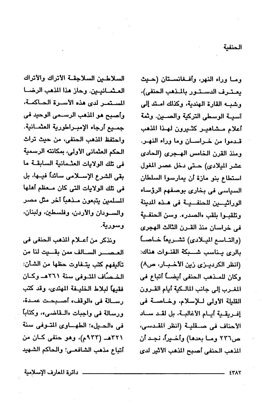 وما وراء النهر، وأفغانستان (حيث يعترف الدستور بالمذهب الحنفى)، وشبه القارة الهندية، وكذلك امتد إلى آسية الوسطى التركية والصين. وثمة أعلام مشاهير كثيرون لهذا المذهب قدموا من خراسان وما وراء النهر. ومنذ القرن الخامس الهجرى (الحادى عشر الميلادى) حتى دخل عصر المغول استطاع بنو مازة أن يمارسوا السلطان السياسى فى بخارى بوصفهم الرؤساء الوراثيين للحنفية فى هذه المدينة وتلقبوا بلقب "الصدر". وسن الحنفية فى خراسان منذ القرن الثالث الهجرى (والتاسع الميلادى) تشريعًا خاصًا بالرى يناسب شبكة القنوات هناك: (انظر الكرديزى زين الأخبار، ص 8) وكان للمذهب الحنفى أيضًا أتباع فى المغرب إلى جانب المالكية أيام القرون القليلة الأولى للإسلام، وخاصة فى إفريقية أيام الأغالبة، بل لقد ساد الأحناف فى صقلية (انظر المقدسى، ص 236 وما بعدها) وأخيرًا، نجد أن المذهب الحنفى أصبح المذهب الأثير لدى السلاطين السلاجقة الأتراك والأتراك العثمانيين. وحاز هذا المذهب الرضا المستمر لدى هذه الأسرة الحاكمة، وأصبح هو المذهب الرسمى الوحيد فى جميع أرجاء الإمبراطورية العثمانية. واحتفظ المذهب الحنفى، من حيث تراث الحكم العثمانى الأولى، بمكانته الرسمية فى تلك الولايات العثمانية السابقة ما بقى الشرع الإِسلامى سائدًا فيها، بل فى تلك الولايات التى كان معظم أهلها المسلمين يتبعون مذهبًا آخر مثل مصر والسودان والأردن، وفلسطين، ولبنان، وسورية.