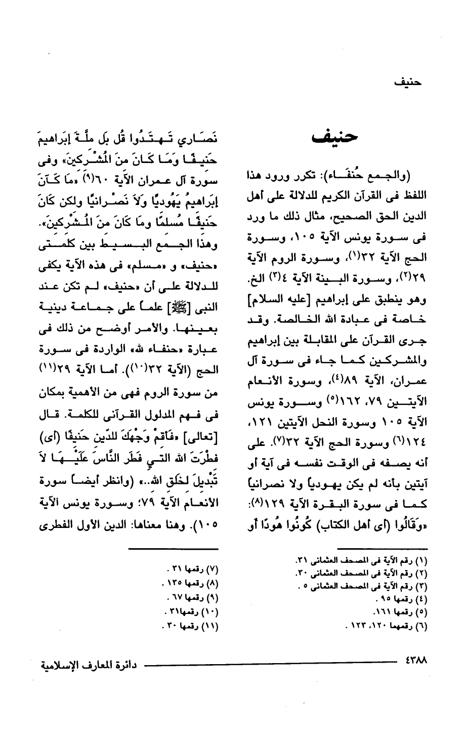 (والجمع حُنفَاء): تكرر ورود هذا اللفظ في القرآن الكريم للدلالة على أهل الدين الحق الصحيح، مثال ذلك ما ورد في سورة يونس الآية 105، وسورة الحج الآية 32 (¬1)، وسورة الروم الآية 29 (¬2)، وسورة البينة الآية 4 (¬3) الخ. وهو ينطبق على إبراهيم [عليه السلام] خاصة في عبادة الله الخالصة. وقد جرى القرآن على المقابلة بين إبراهيم والمشركين كما جاء في سورة آل عمران عمران، الآية 89 (¬4)، وسورة الأنعام الآيتين 79، 162 (¬5) وسورة يونس الآية 105 وسورة النحل الآيتين 121، 124 (¬6) وسورة الحج الآية 32 (¬7). على أنه يصفه في الوقت نفسه في آية أو آيتين بأنه لم يكن يهوديًا ولا نصرانيًا كما في سورة البقرة الآية 129 (¬8): "وَقَالُوا (أي أهل الكتاب) كُونُوا هُودًا أو نَصَاري تَهتَدُوا قُل بَل مِلَّةَ إبَراهيمَ حَنِيفًا وَمَا كَانَ منَ المُشركينَ" وفى سورة آل عمران الآية 60 (¬9) "مَا كَانَ إبَراهيمُ يَهُوديًا وَلَا نَصْرانيًا ولكن كَانَ حَنيفَا مسلمًا ومَا كَانَ منَ الْمُشركينَ". وهذَا الجمَع البسيطَ بين كلَمَتي "حنيف" و"مسلم" في هذه الآية يكفى للدلالة على أن "حنيف" لم تكن عند النبي [- صلى الله عليه وسلم -] علمًا على جماعة دينية بعينها. والأمر أوضح من ذلك في عبارة "حنفاء لله" الواردة في سورة الحج (الآية 32) (¬10). أما الآية 29 (¬11) من سورة الروم فهى من الأهمية بمكان في فهم المدلول القرآنى للكلمة. قال [تعالى] " {فَأَقِمْ وَجْهَكَ لِلدِّينِ حَنِيفًا (أي) فِطْرَتَ اللَّهِ الَّتِي فَطَرَ النَّاسَ عَلَيْهَا لَا تَبْدِيلَ لِخَلْقِ اللَّهِ. .} (وانظر أيضًا سورة الأنعَامَ الآية 79: وسورة يونس الآية 105). وهنا معناها: الدين الأول الفطرى