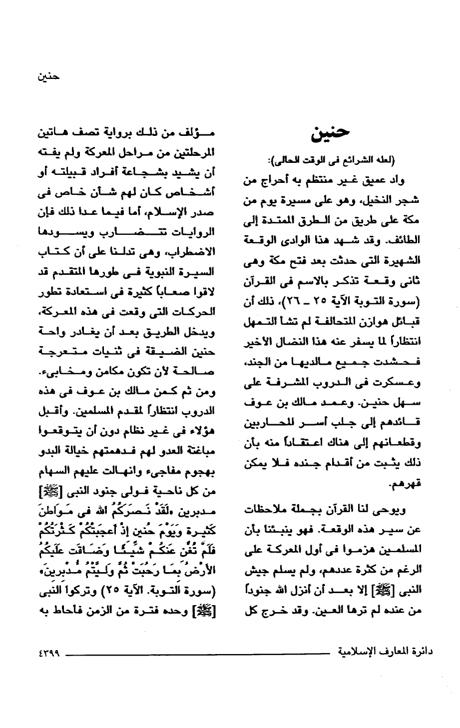 ويوحى لنا القرآن بجملة ملاحظات عن سير هذه الوقعة. قهو ينبئنا بأن المسلمين هزموا في أول المعركة على الرغم من كثرة عددهم، ولم يسلم جيش النبي [- صلى الله عليه وسلم -] إلا بعد أن أنزل الله جنودًا من عنده لم ترها العين. وقد خرج كل مؤلف من ذلك برواية تصف هاتين المرحلتين من مراحل المعركة ولم يفته أن يشيد بشجاعة أفراد قبيلته أو أشخاص كان لهم شأن خاص في صدر الإسلام، أما فيما عدا ذلك فإن الروايات تتضارب ويسودها الاضطراب، وهي تدلنا على أن كتاب السيرة النبوية في طورها المتقدم قد لاقوا صعابًا كثيرة في استعادة تطور الحركات التي وقعت في هذه المعركة، ويدخل الطريق بعد أن يغادر واحة حنين الضيقة في ثنيات متعرجة صالحة لأن تكون مكامن ومخابئ.